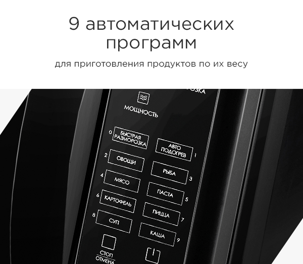 С помощью 9 автоматических программ можно сделать молочные каши, сытные закуски, легкие крем-супы, вторые блюда из мяса, рыбы и овощей, разнообразные гарниры. Технология приготовления с помощью микроволн позволяет отказаться от использования масла – ваши блюда приготовятся быстрее, чем на обычной плите или в духовке, и получатся более диетическими.