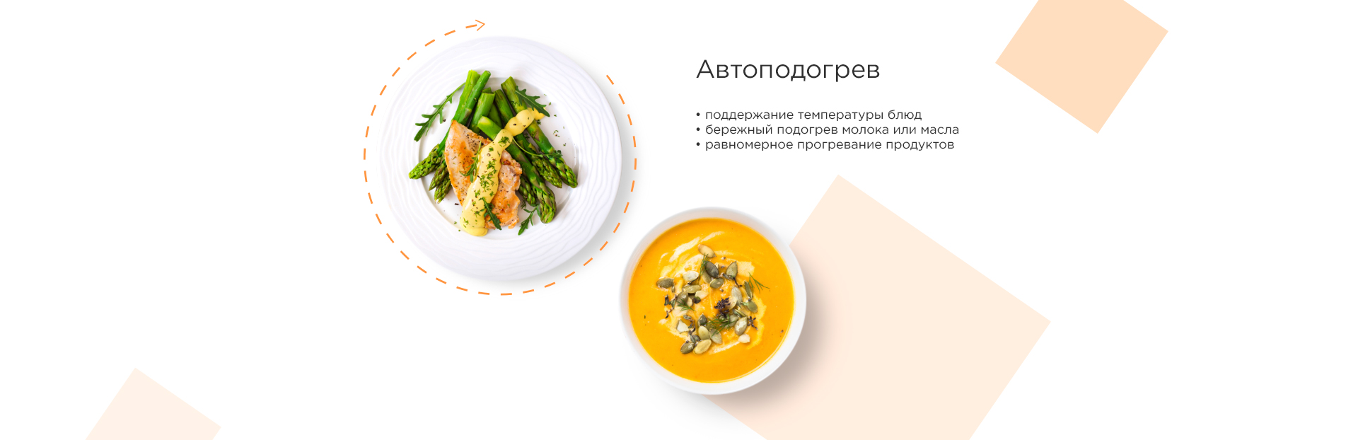 Для плавного и равномерного прогревания продуктов используйте автоматическую программу АВТОПОДОГРЕВ. Этот способ вы можете выбрать для поддержания температуры готовых блюд, разогрева еды заблаговременно, а также для бережного подогрева охлажденного молока или размягчения сливочного масла.
