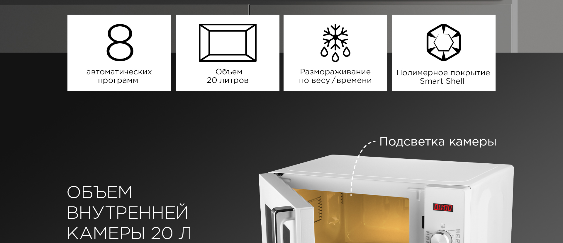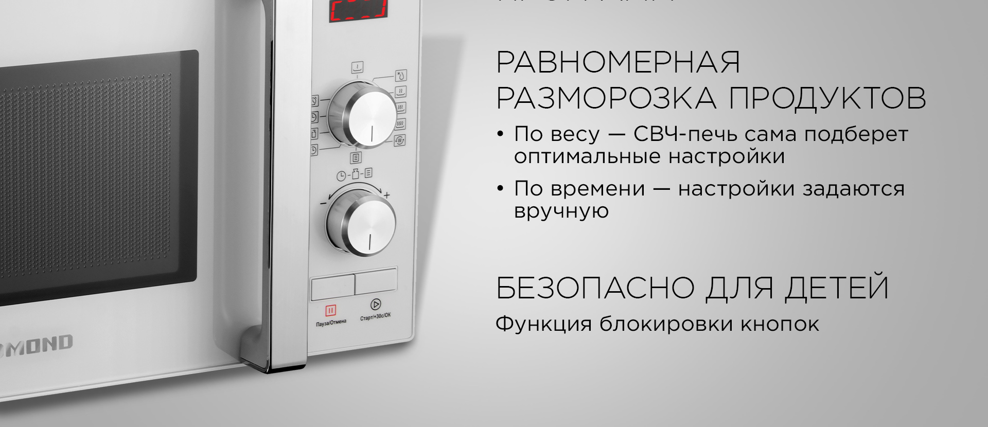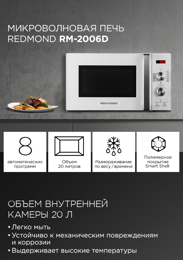 СВЧ-печь RM-2006D – универсальное устройство для размораживания, разогрева и приготовления различных блюд: каш, супов, запеканок и десертов. Объем рабочей камеры RM-2006D — 20 литров. Благодаря компактным размерам печь без труда разместится даже в небольшом пространстве: в квартире-студии, на офисной или дачной кухне.