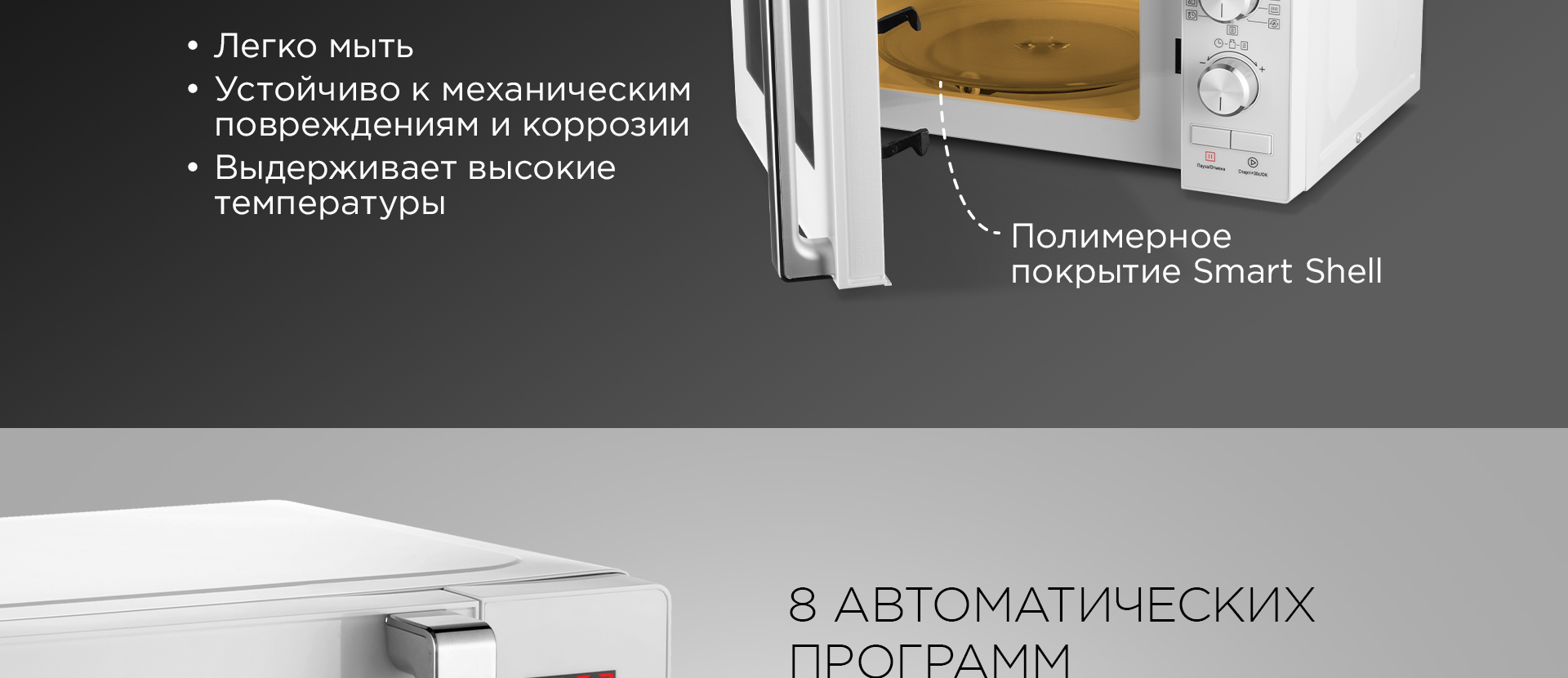 У модели 8 автоматических программ: ОВОЩИ, РЫБА, МЯСО, ПАСТА, КАРТОФЕЛЬ, МОЛОКО, СУП и АВТОПОДОГРЕВ. Вам не нужно вычислять время и подходящую мощность для приготовления лосося, фрикаделек или рагу из кабачков и баклажанов. Выберите нужный режим, укажите вес продукта и нажмите кнопку «Старт» — настройки печь установит автоматически. Если вы готовите по собственному рецепту, применяйте удобную ручную настройку.