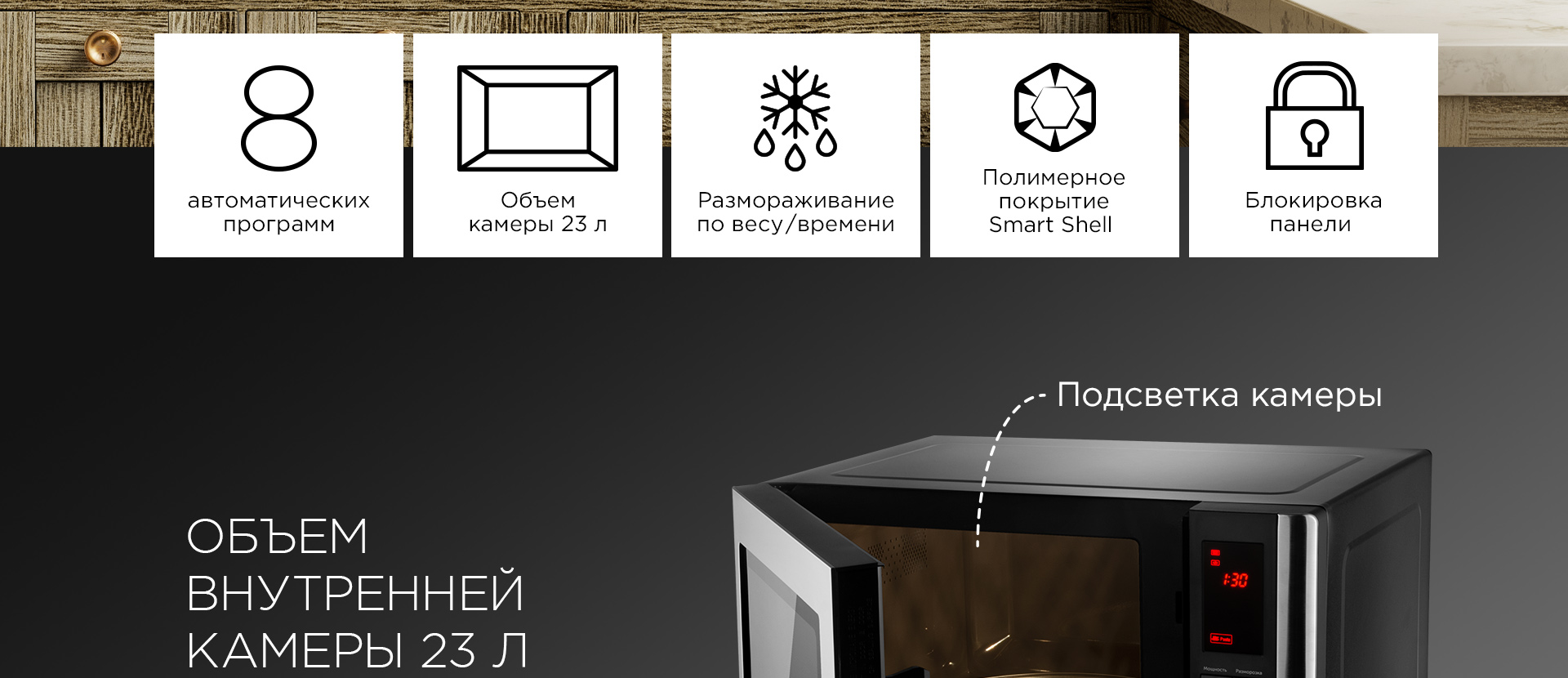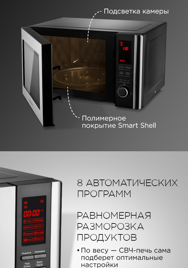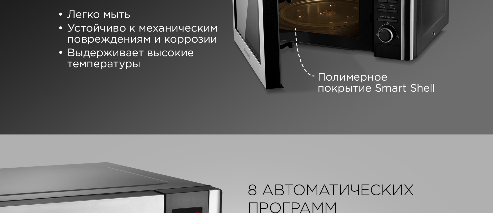 Полимерное покрытие рабочей камеры устойчиво к высоким температурам, механическим повреждениям и коррозии. Покрытие SMART SHELL не меняет цвет, а за его гладкой поверхностью легко ухаживать — вы с легкостью очистите камеру СВЧ-печи от жирных брызг.