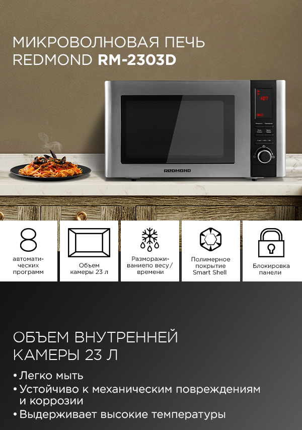 Микроволновая печь REDMOND RМ-2303D с автоматическими программами позволит легко и максимально быстро размораживать продукты, разогревать готовую еду и готовить разнообразные блюда – от супов и каш до выпечки и десертов.