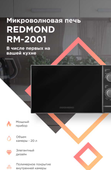 REDMOND предоставляет еще больше возможностей для приготовления вкусных и полезных блюд! Компактная микроволновая печь RM-2001 на 20 л в элегантном классическом дизайне отлично впишется в интерьер современной кухни и порадует вас широким диапазоном возможностей и простотой в использовании!