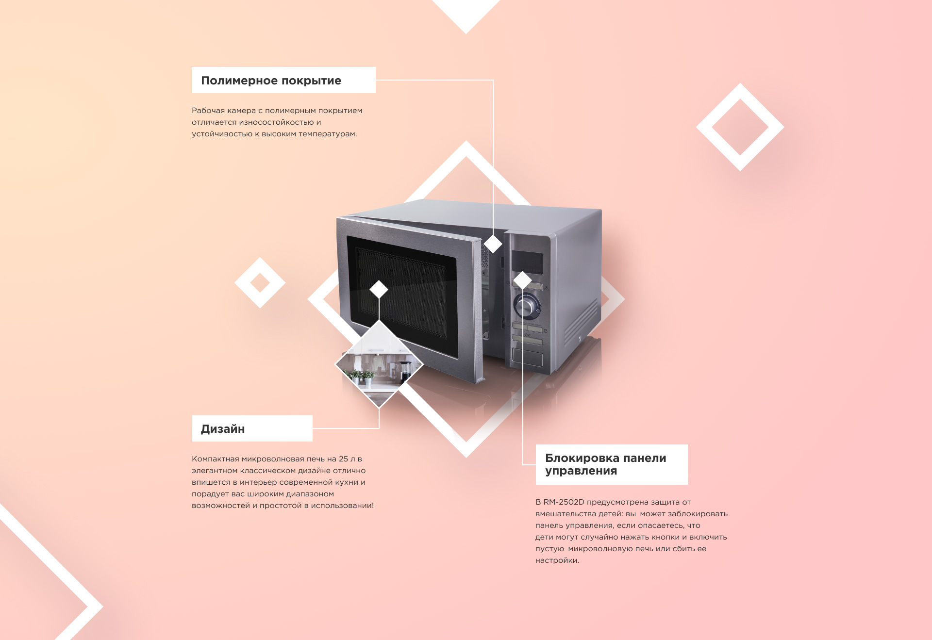 Корпус микроволновой печи и внутреннее покрытие рабочей камеры RM-2502D изготовлены из нержавеющей стали – она устойчива к высоким температурам и отличается высокой износостойкостью и простотой в уходе. Чтобы не пускать холодный воздух в камеру и не нарушать технологию приготовления на режимах «Конвекция» и «Гриль», следите за приготовлением блюда через стеклянное окошко на дверце прибора.