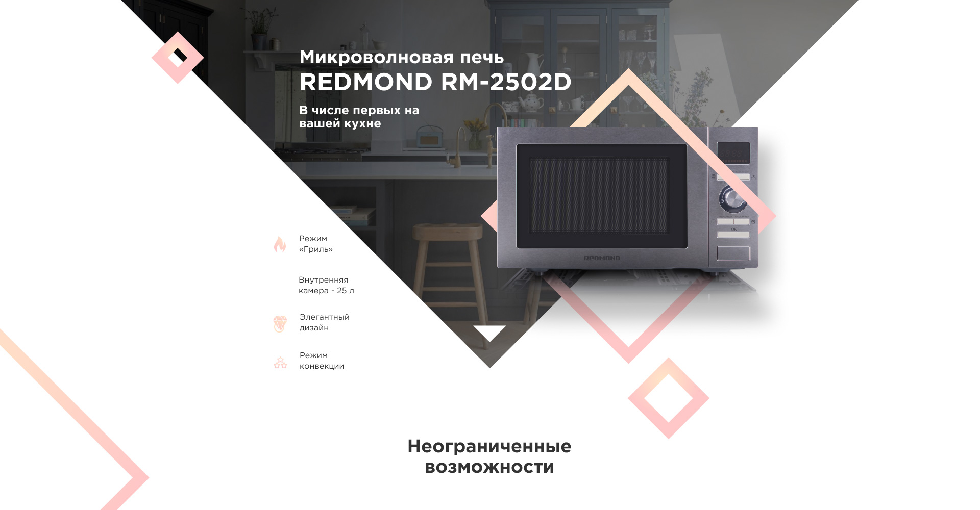 Микроволновая печь REDMOND RM-2502D – современный и многофункциональный прибор «3 в 1». Он совмещает в себе возможности стандартной микроволновки и духового шкафа, который снабжен режимом усиления конвекции и может приготовить блюда гриль на решетке.
