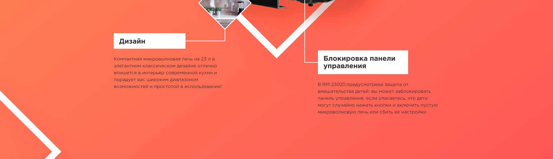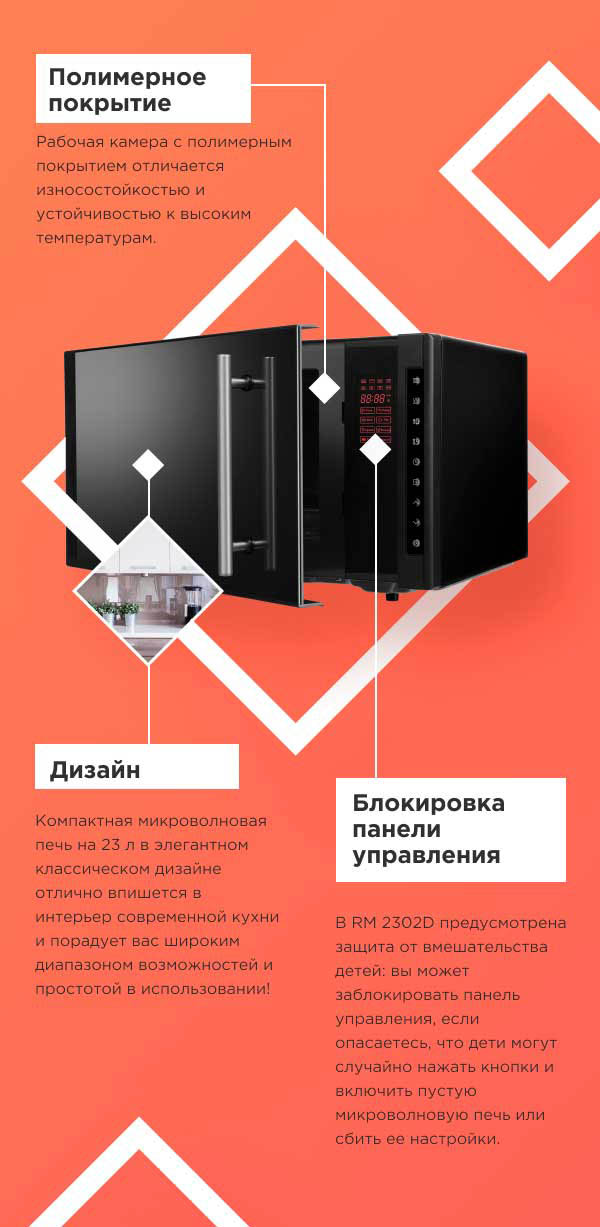 Микроволновая печь RМ-2302D – современный многофункциональный прибор для разморозки и разогрева продуктов, приготовления блюд из мяса, рыбы или овощей. В RМ-2302D можно быстро приготовить омлет с прованскими травами на завтрак, запечь мясо в горшочках или подогреть пиццу ко встрече с друзьями.
