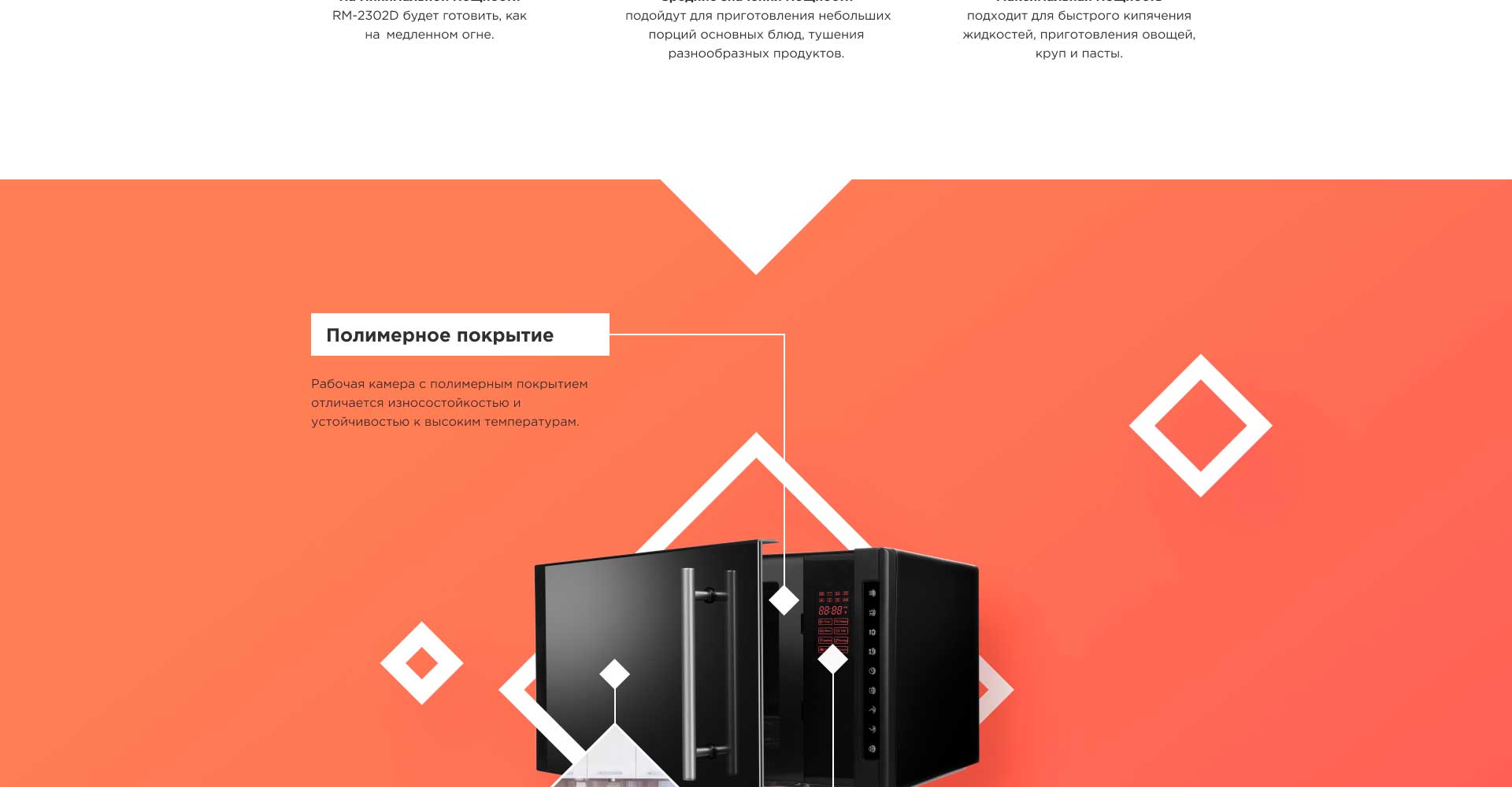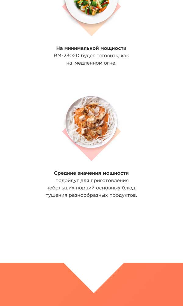 RМ-2302D выполнена в элегантном дизайне и станет украшением на любой кухне. Панель управления делает управление прибором интуитивным и максимально понятным, а внутренняя подсветка камеры поможет без особых хлопот следить за приготовлением блюда через стеклянное окошко на дверце.