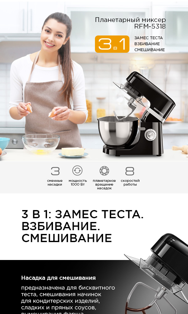 RFM-5318 оснащен прочной металлической чашей объемом 4,5 л, в которой вы сможете взбить яйца для двух порций омлета или замесить тесто для большого праздничного торта.