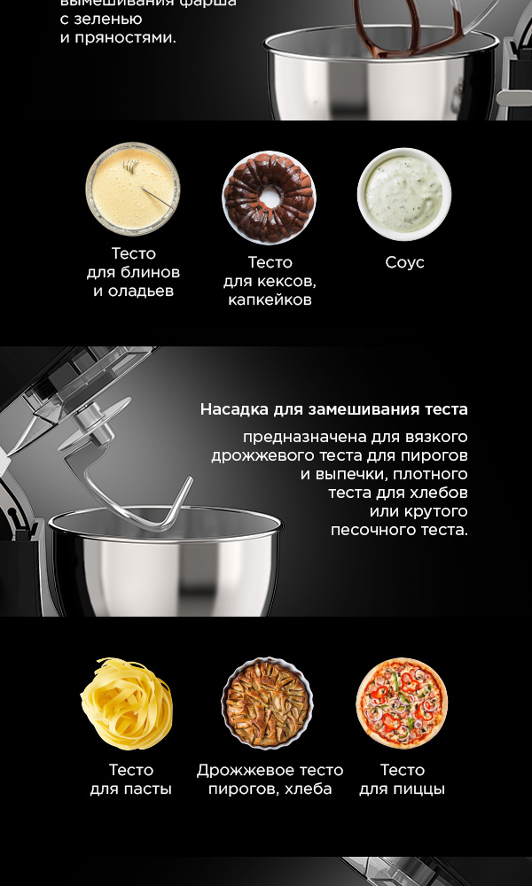Мощный и красивый помощник. Помогает в самых разных задачах - и замешивает начинку или фарши. Делает крема, замешивает тесто. Очень понравились насадки, сделаны очень прочно и надежно. Чаша правильной формы, такой когда замешивать можно и минимальные порции.