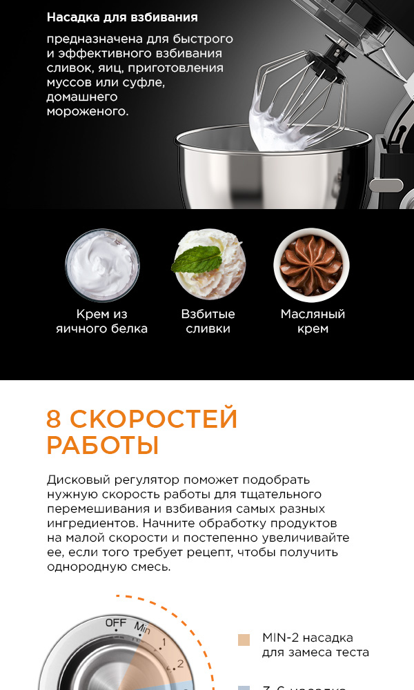 Удобный регулятор скорости позволит легко подобрать оптимальный режим для обработки разных продуктов прямо в процессе смешивания и взбивания. Используйте минимальную скорость для замешивания дрожжевого теста, среднюю – для приготовления густого крема и бисквитного теста, максимальную – для взбивания сливок или яиц.