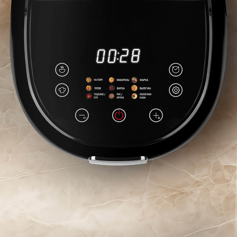 Мультиварка имеет интуитивно понятное управление. Достаточно несколько раз коснуться сенсорной панели, чтобы задать нужные параметры. На цветном дисплее отображается выбранная программа и время до окончания приготовления.