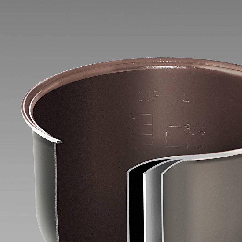 Изнутри чаша покрыта антипригарным керамическим слоем. На нем готовят почти без масла — так ваш рацион станет более здоровым, а продукты не пригорят даже при обжаривании.