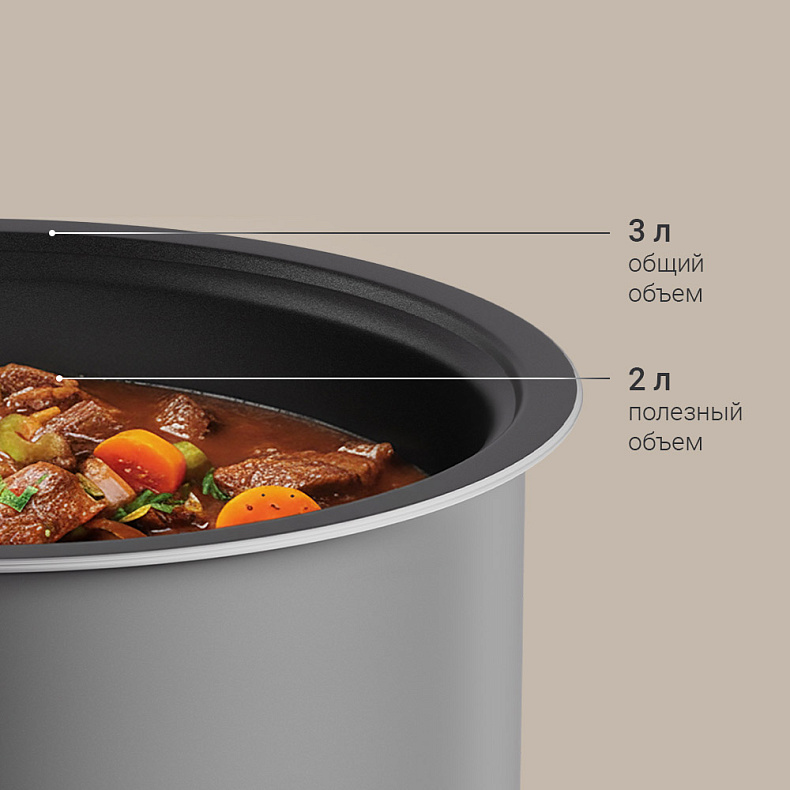 Чаша оптимального объема рассчитана на 3–5 порций, подойдет для одного человека или небольшой семьи. Благодаря компактному размеру она поместится даже в небольшом холодильнике. Удобные ручки и внутренняя мерная шкала делают работу с чашей простой и комфортной. Общий объем изделия (3 литра) — вместимость чаши до краев, а полезный объем, то есть рекомендуемый уровень заполнения чаши перед приготовлением для оптимальной работы мультиварки — 2 литра.
