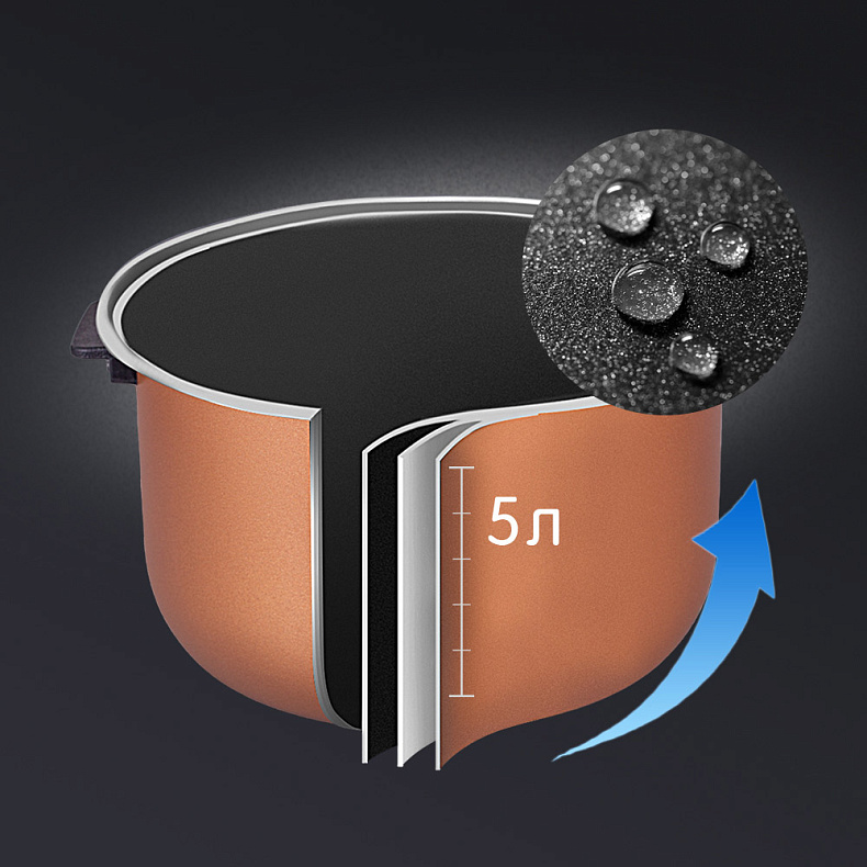 Чаша увеличенной вместимости позволяет готовить до 6–8 порций одновременно. Антипригарное покрытие предотвращает прилипание ингредиентов и облегчает уход. Общий объем, то есть полная емкость, составляет 5 л, а рекомендуемый для корректной и эффективной работы мультиварки полезный объем заполнения — 3,5 л.