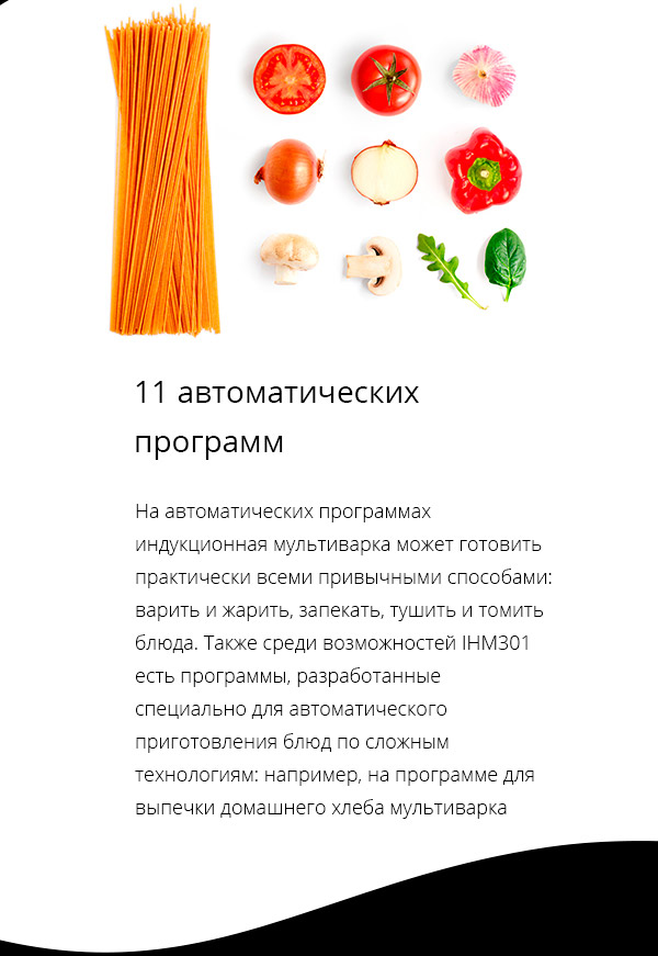 мультиварка с современной технологией индукционного нагрева. Готовит быстро. Управление интуитивно понятное. Большая книга с рецептами в комплекте. Стандартная комплектация для мультиварок. Сокращает время приготовления. Это прям очень радует.