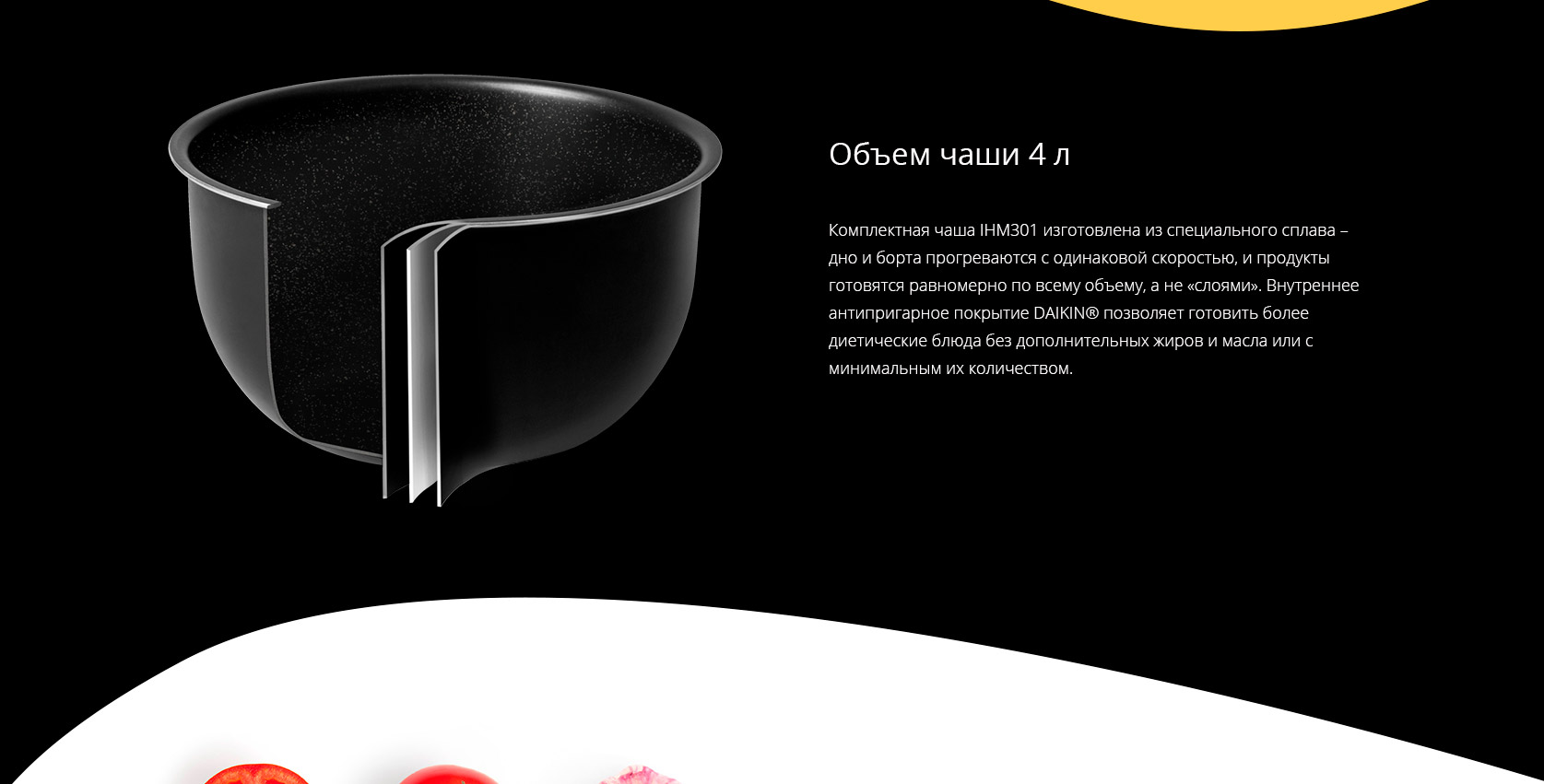 Мгновенный нагрев в отличии от старой моей мультиварки, возможно жарить еду благодаря быстрому индукционному нагреву. Возможно благодаря моментальному изменению температуры, готовые блюда получаются лучше. Как минус чаша на 4 литра, хотелось бы на 5.