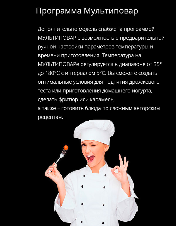 Узнала от подруги про индукционную мультиварку и решила себе приобрести. Готовит очень быстро в отличие от предыдущей. Удобное и легкое управление. Мало тратит электроэнергии и точно распределяет температурный режим. Легко и просто в уходе.