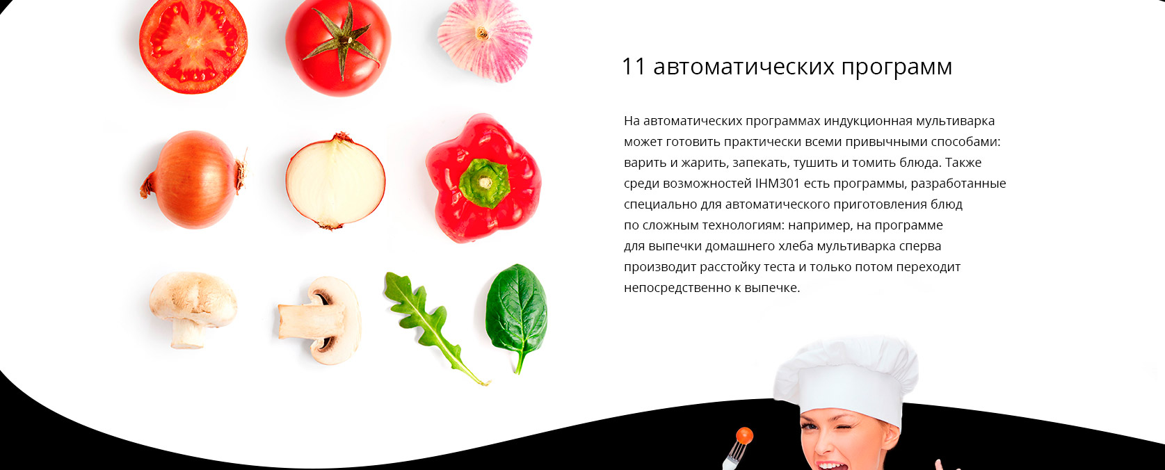Мультиварка что надо! Индукционный нагрев ускоряет нагревание и делает его равномерным.Есть с чем сравнивать.(первая мультя без индукции)Программ много,книга рецептов в подарок.Меню понятное.Внешне красивая.Чаша разве что маловата,но не критично.Выполнена добротно.Вначале был посторонний запах,прокипятила воду и всё. При последующих готовках не осталось и следа. Готовит все на ура! Каши,курицу,чечевицу,плов-всё вкусно! Однозначно рекомендую к покупке!
