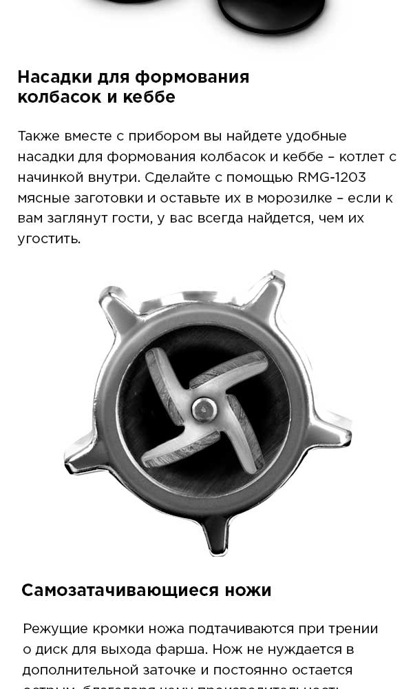 В комплекте RMG-1203 вы найдете 3 перфорированных диска для приготовления фарша и 2 сменных насадки для удобного формирования колбасок и кеббе: