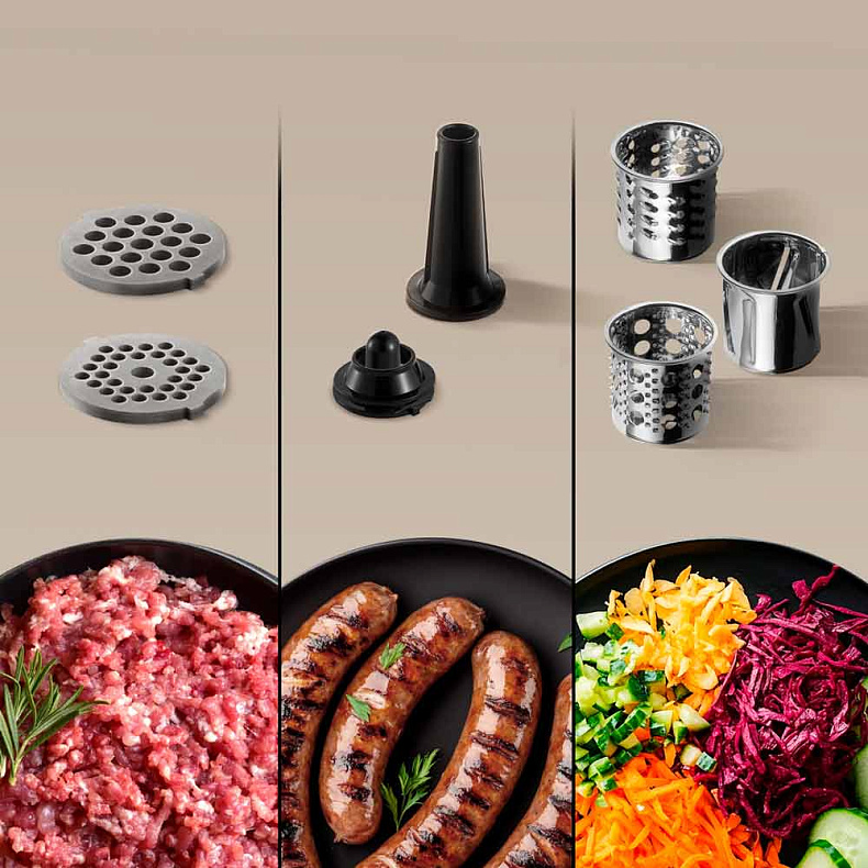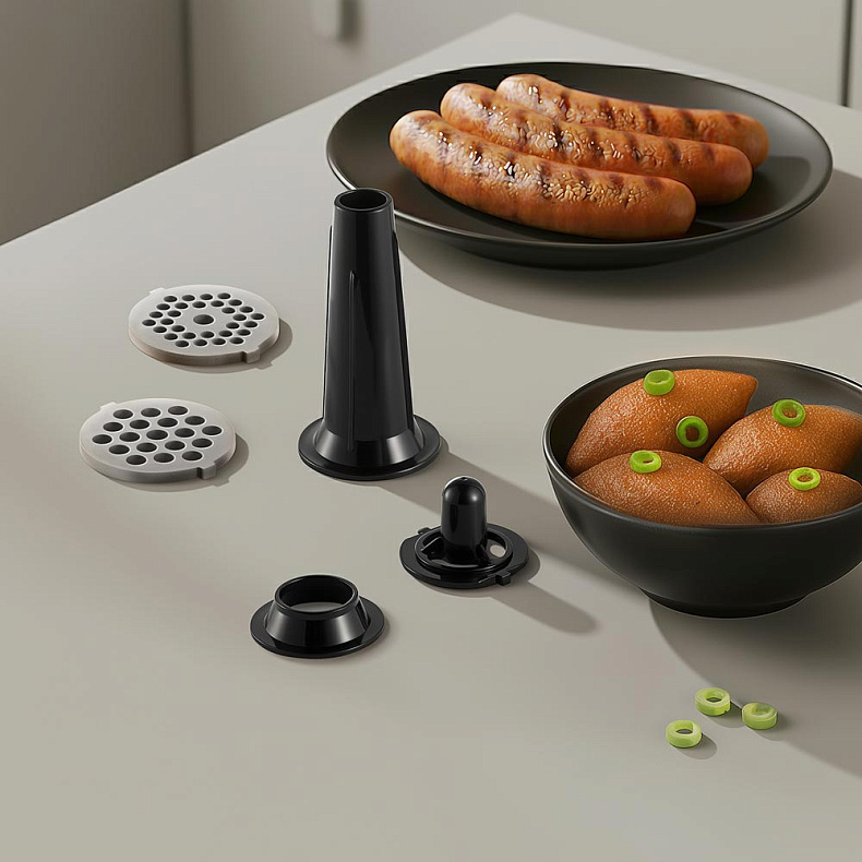 Для приготовления фарша нужной консистенции в комплекте есть два перфорированных диска с отверстиями разного диаметра: 5 мм — для рыбы, жесткого мяса и орехов, 7 мм — для классических котлет и фрикаделек. А насадки для домашних колбасок и кеббе позволят легко разнообразить меню и готовить вкусные, натуральные блюда без консервантов и лишних добавок.