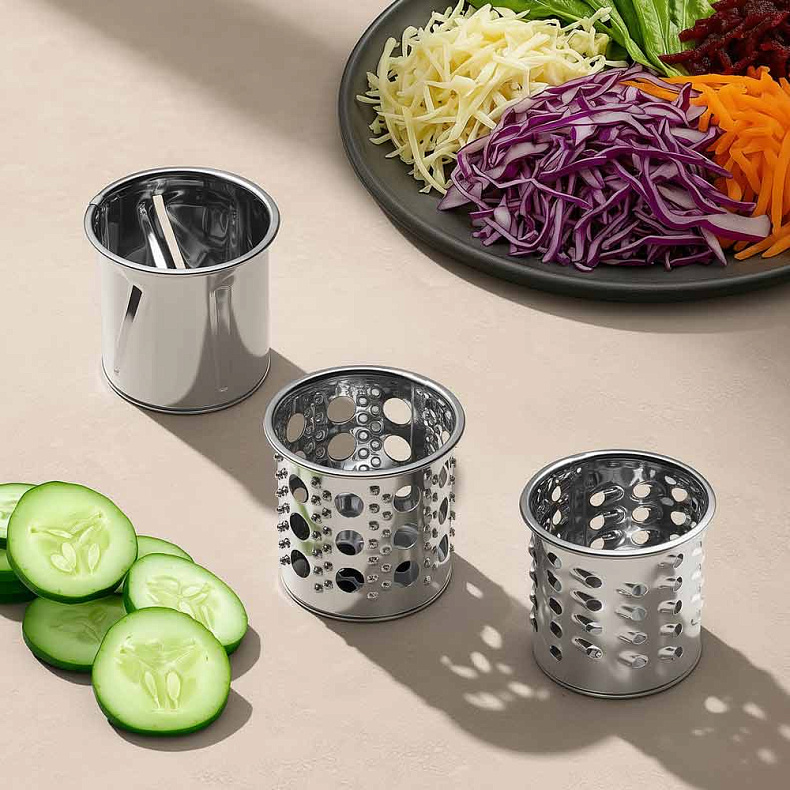 Подходит тем, кто часто готовит салаты, а также овощные и фруктовые пюре. В комплекте — три насадки для разных задач.
