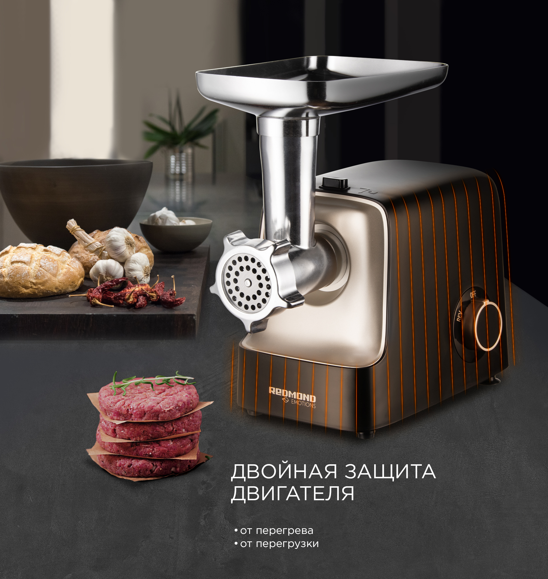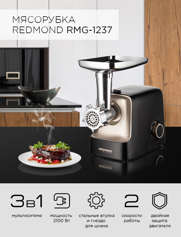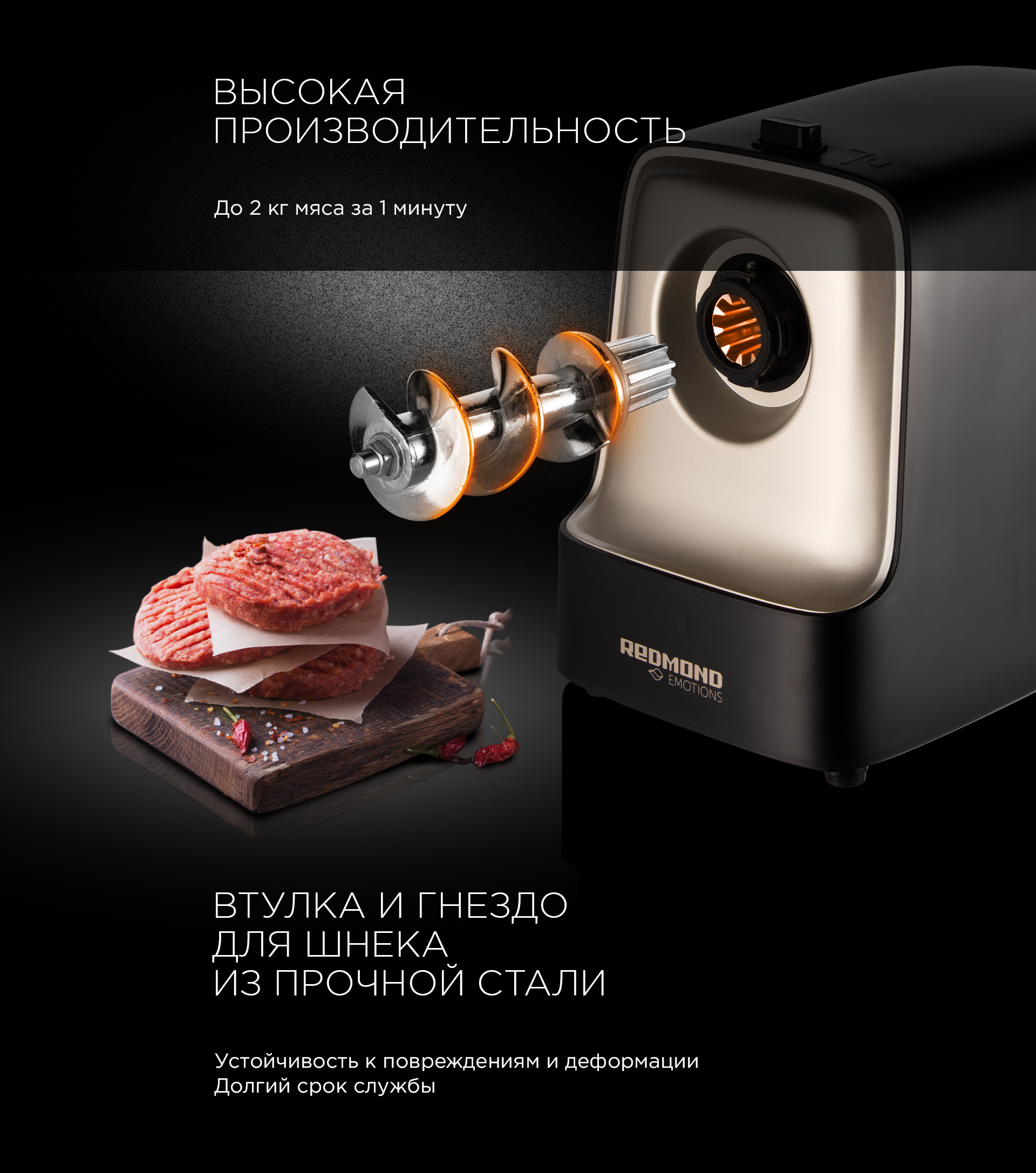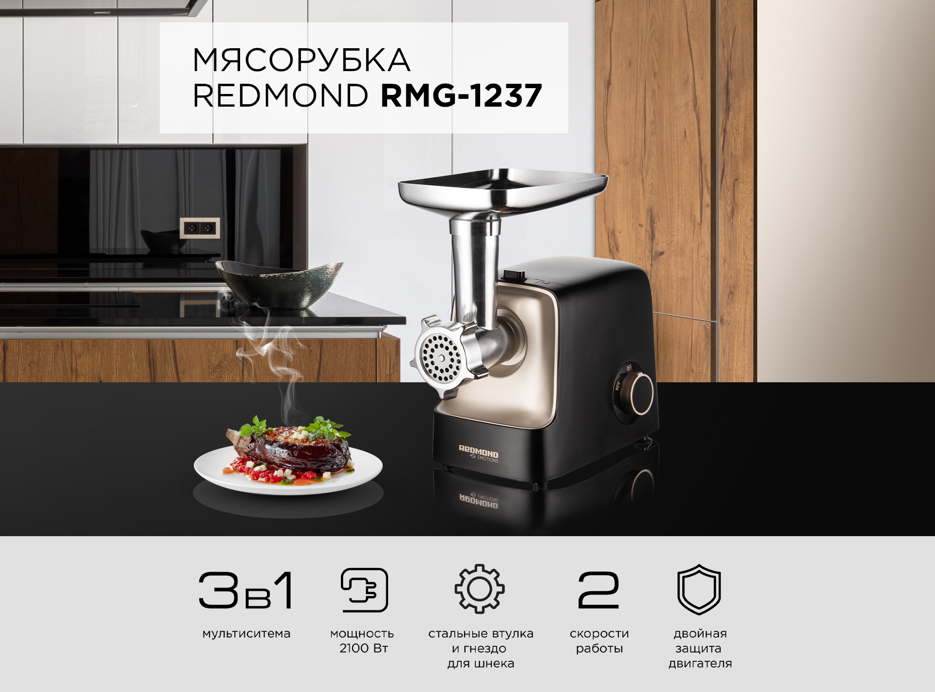 Мясорубка REDMOND RMG-1237 – это мультисистема «3 в 1» для удобного приготовления фарша разного помола и формования натуральных деликатесов: колбасок и восточных кеббе.