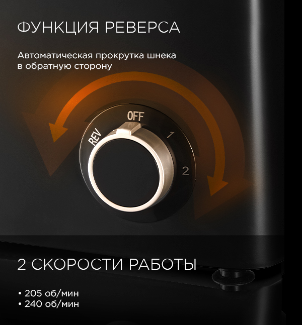 Если в мясорубку вдруг попадет жесткая жила или косточка, и работа прибора замедлится, воспользуйтесь реверсом. Движение шнека запустится в обратную сторону, масса продуктов переместится в сторону загрузочного отверстия, и вы сможете легко устранить помеху, не разбирая устройство.