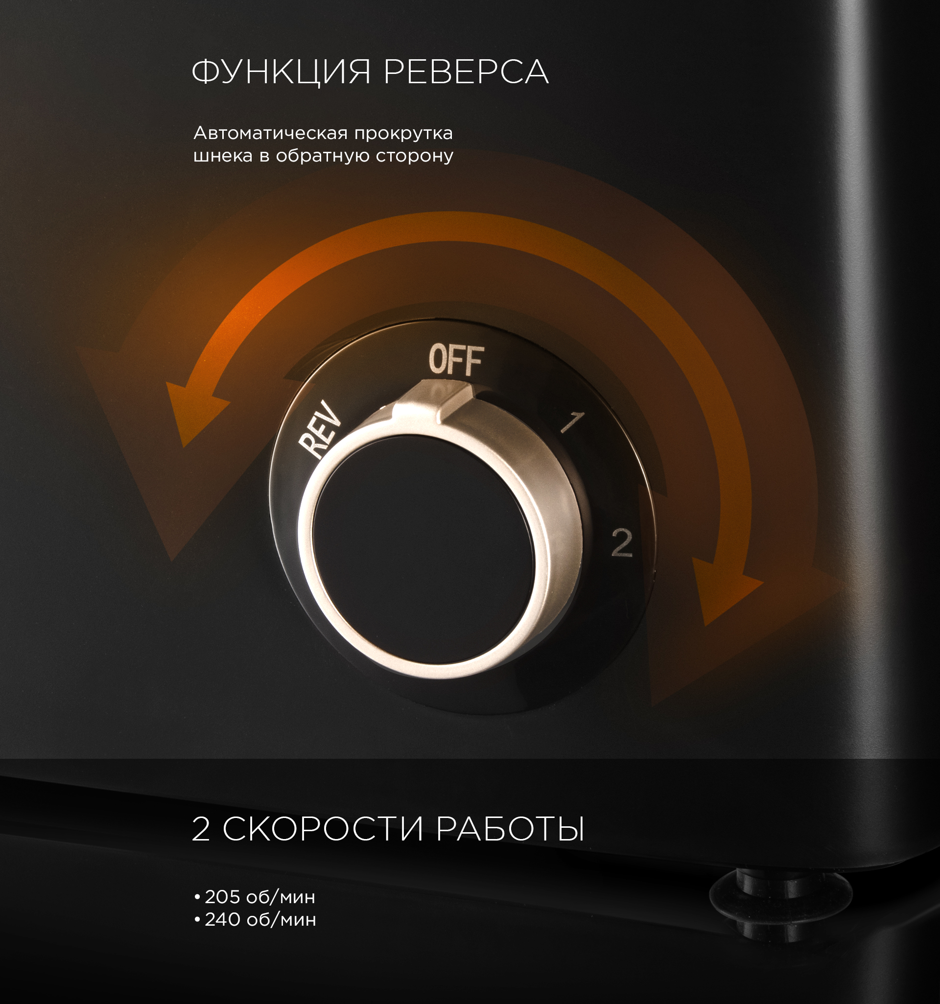 Выберите оптимальную скорость вращения шнека для переработки продуктов разной плотности. Стандартная скорость подойдет для приготовления овощной икры, фруктового повидла, фарша из рыбы, домашней птицы, телятины. Увеличив скорость, вы быстро сделаете фарш из свинины и говядины.