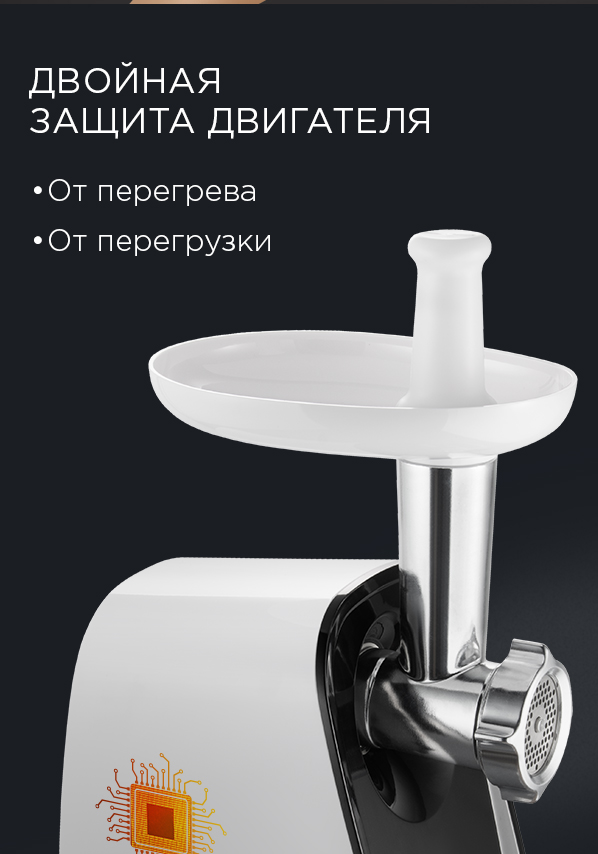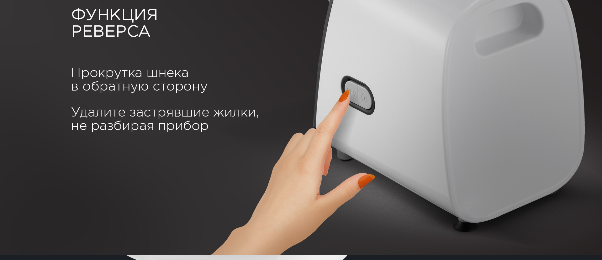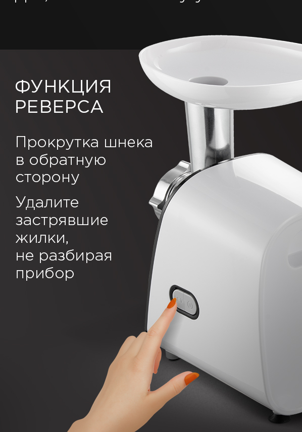 На случай, если рабочий отсек окажется забит и работа мясорубки замедлится, предусмотрена функция реверса. Включите ее, и шнек начнет прокручиваться в обратную сторону, перемещая ингредиенты обратно к загрузочному отверстию. Это поможет быстро удалить излишки, не разбирая прибор на части.