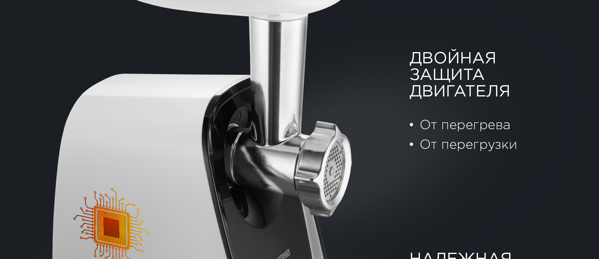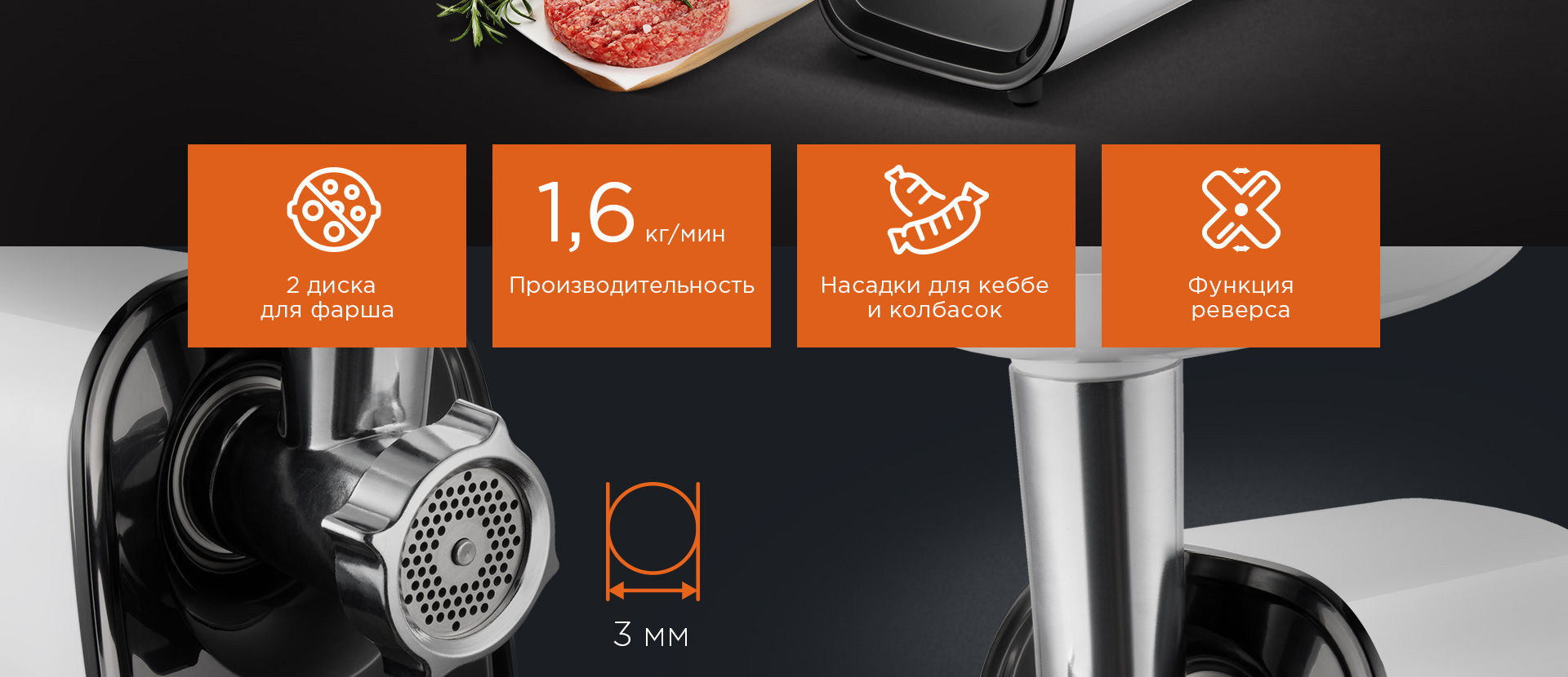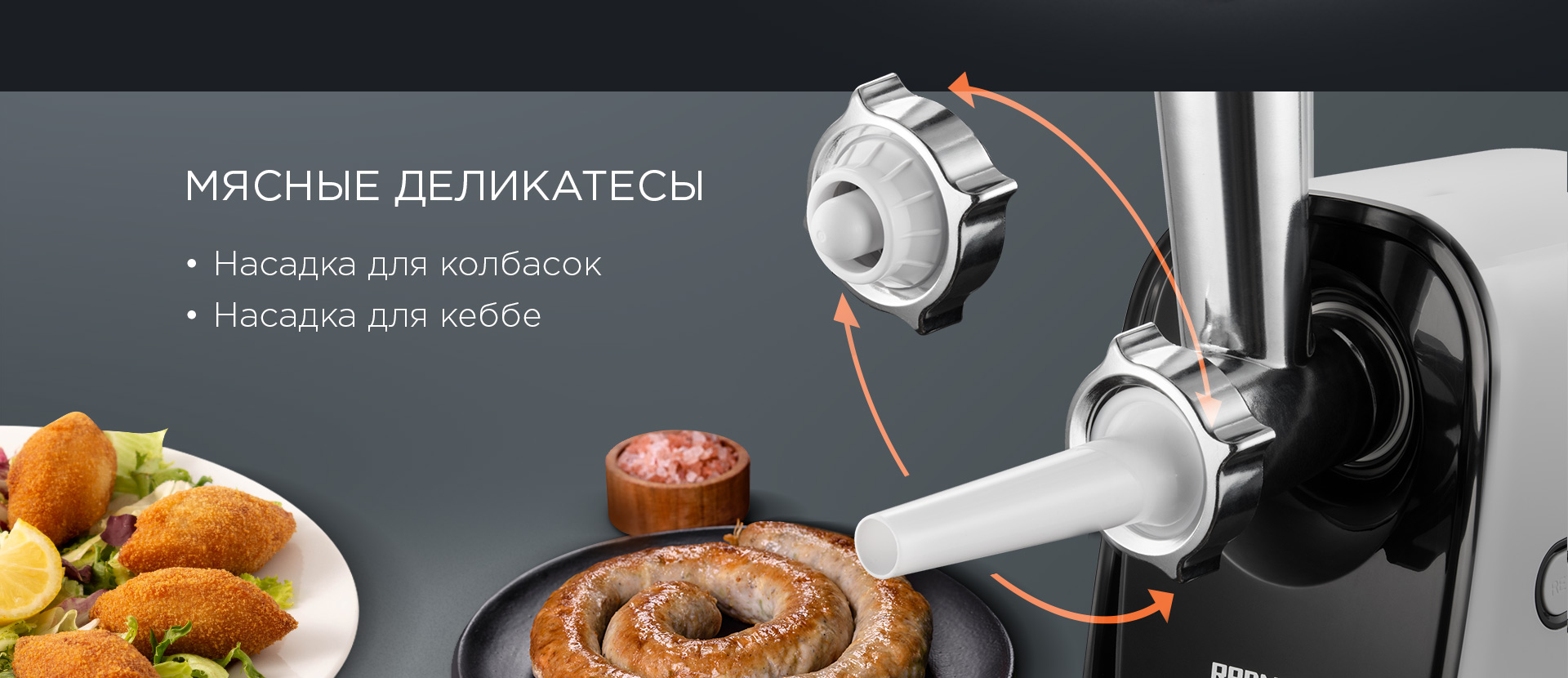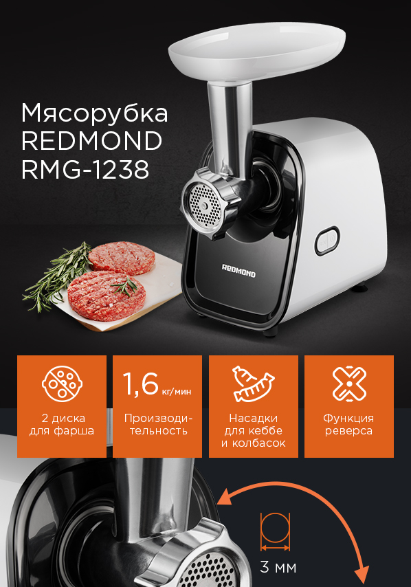 С многофункциональной мясорубкой RMG-1238 вы сможете быстро и без лишних усилий приготовить ингредиенты для домашних деликатесов: измельчить мясо для фарша разного помола и сформовать заготовки для колбасок и кеббе. Стильный и компактный прибор обладает высокой производительностью — всего за минуту мясорубка перерабатывает до 1,6 кг.