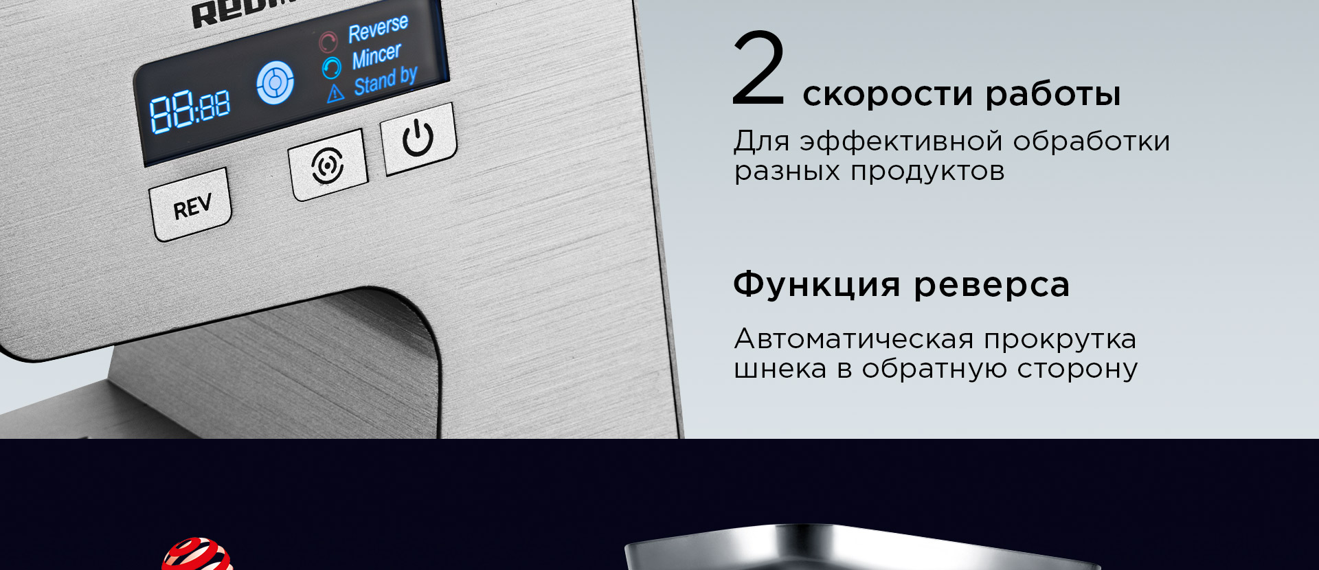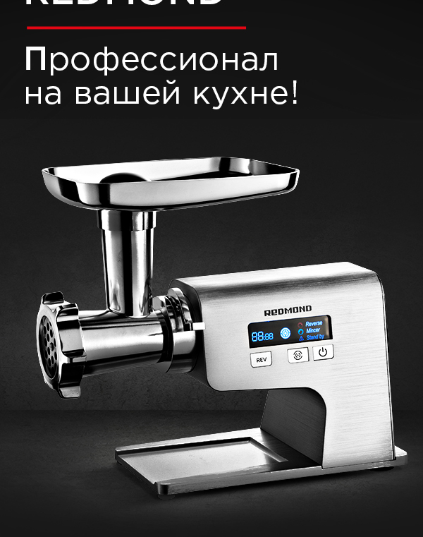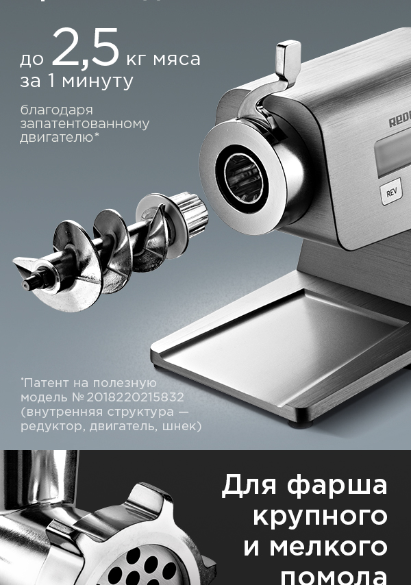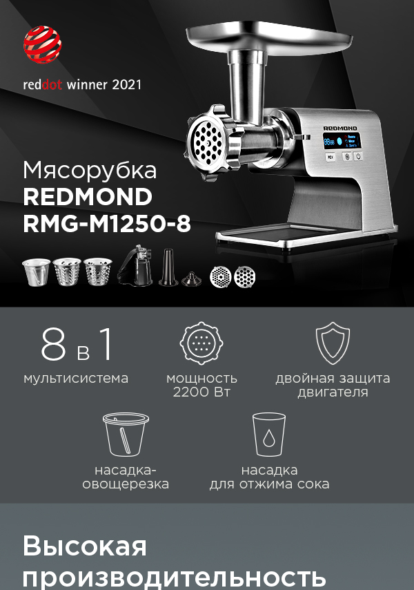 Мясорубка REDMOND RMG-M1250-8 – это мультисистема «8 в 1» с широким выбором сменных насадок, способная заменить несколько полноценных кухонных устройств. Вы сможете использовать RMG-M1250-8 не только для переработки мяса, но и для формования колбасок и кеббе, терки и шинковки овощей и приготовления витаминных соков. Благодаря высокой мощности мясорубка может воспроизвести до 2,5 кг фарша всего за 1 минуту.