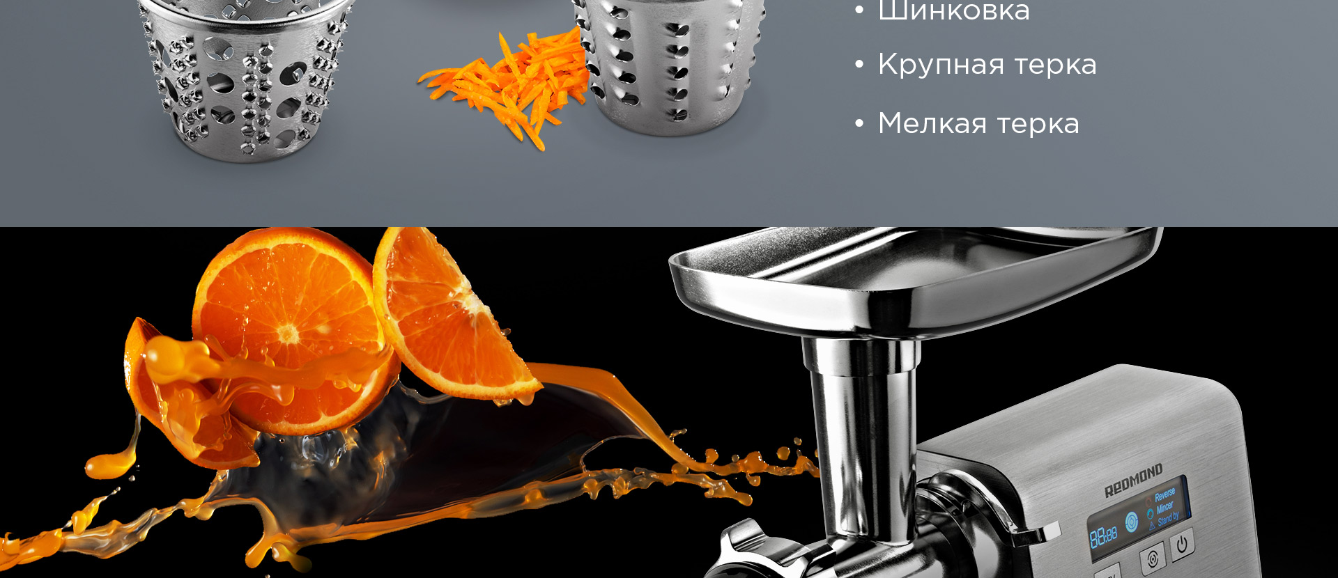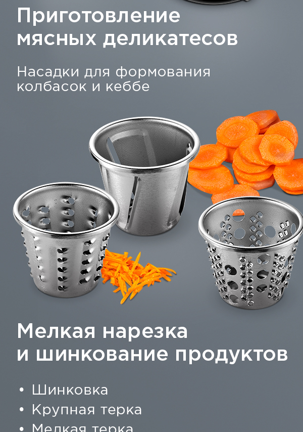 RMG-M1250-8 оснащена 3 насадками для измельчения овощей. Мелкая терка, крупная терка и шинковка помогут существенно сократить время приготовления многих блюд. С их помощью вы быстро натрете картофель для драников, нарежете огурцы, яблоки или сыр для салатов.