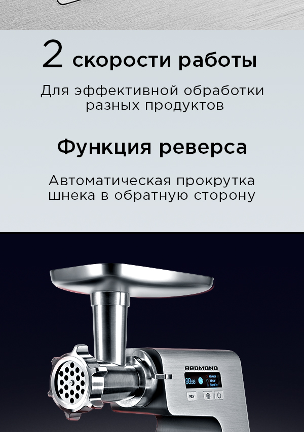 Если попавшая в рабочей отсек крупная жилка намотается на шнек, затруднив работу прибора, включайте реверс. Шнек прокрутится в обратную сторону, освободится от помехи, и вам не нужно будет тратить время, чтобы разобрать и очистить мясорубку вручную.
