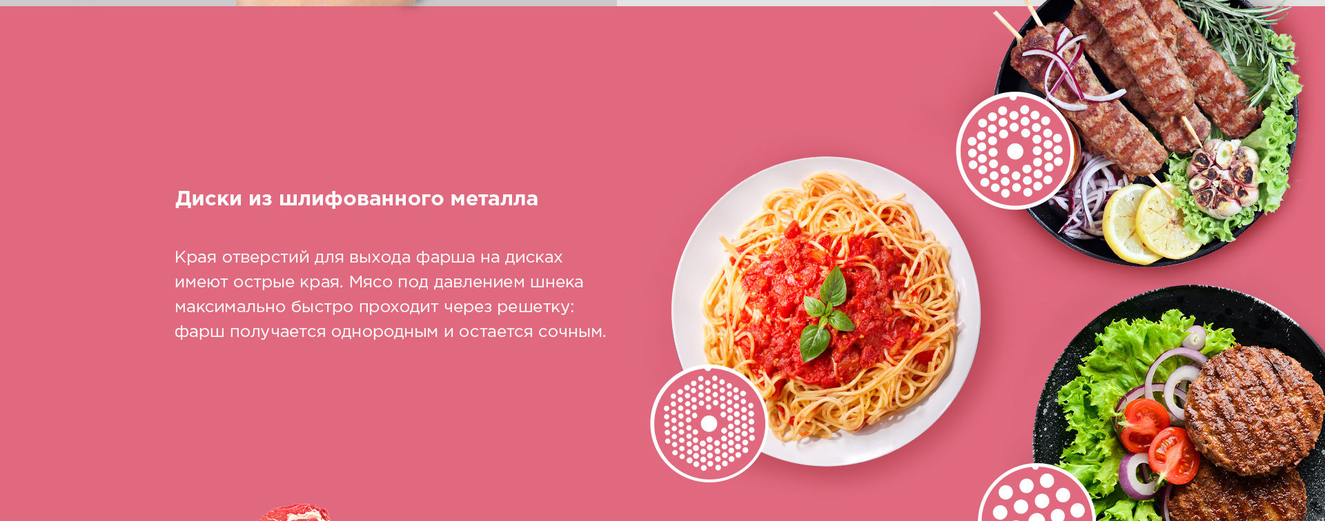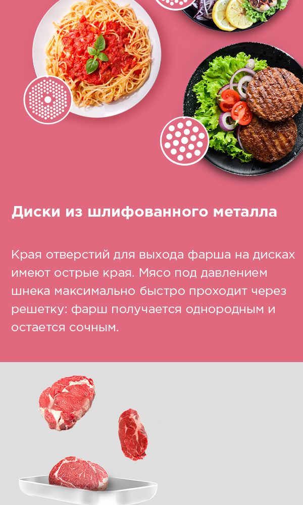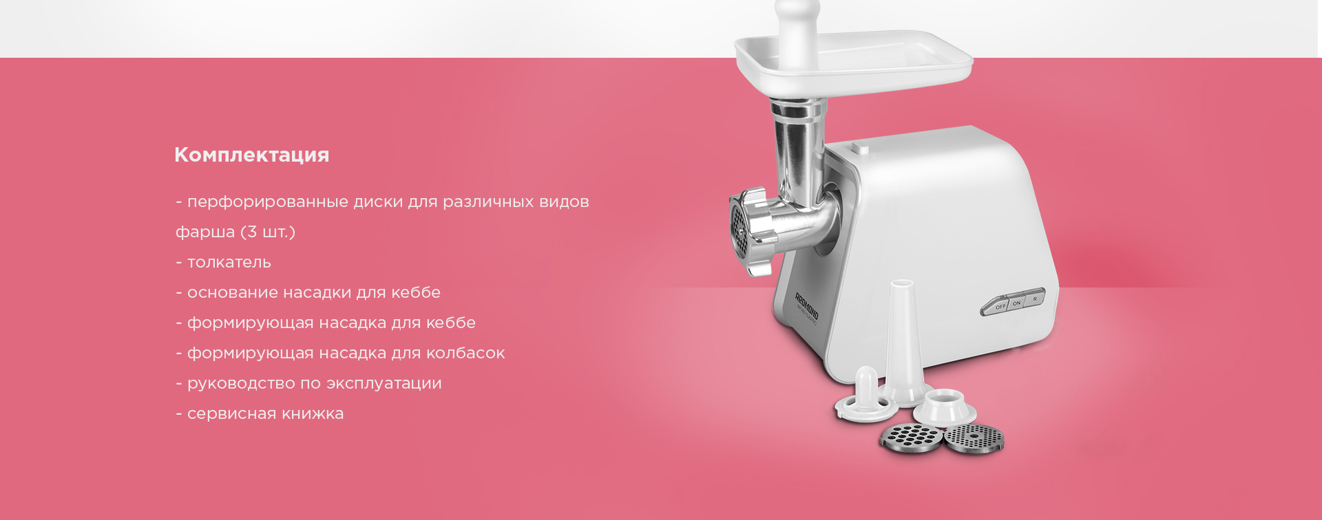 Мясорубка прекрасно справляется с любым видом мяса, за счет высокой мощности. В комплекте три решетки и насадки для колбас, теперь часто балую всю семью домашней колбасой, съедается почти за считанные минуты, такая она вкусная. На мой взгляд, чуть шумновата, но за минус это не считаю, все-таки здесь металлическое крепление шнека. И еще один плюс к надёжности это несколько степеней защиты двигателя-от перегрева и от перегрузки. Очень довольна.