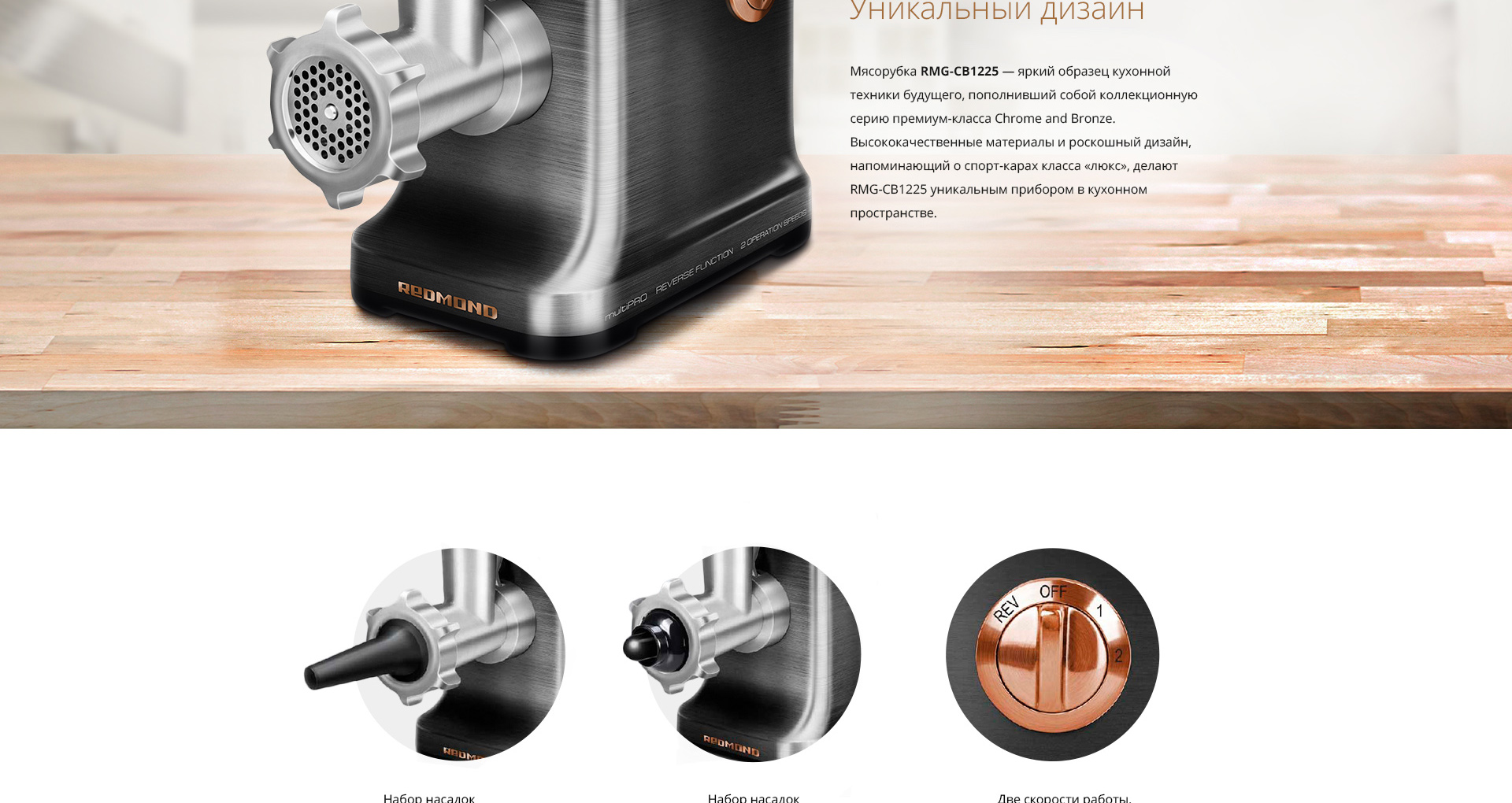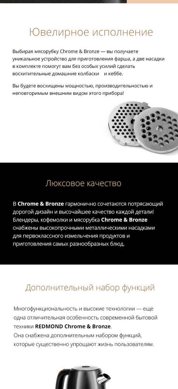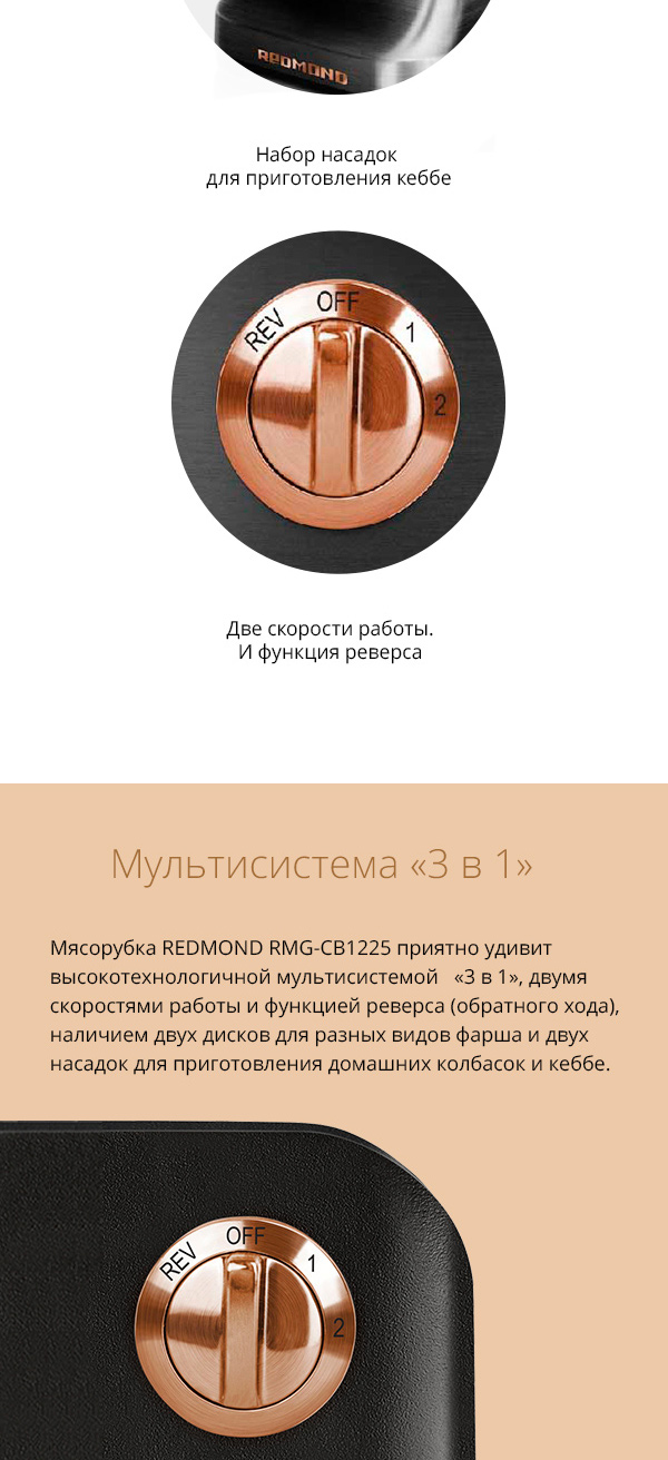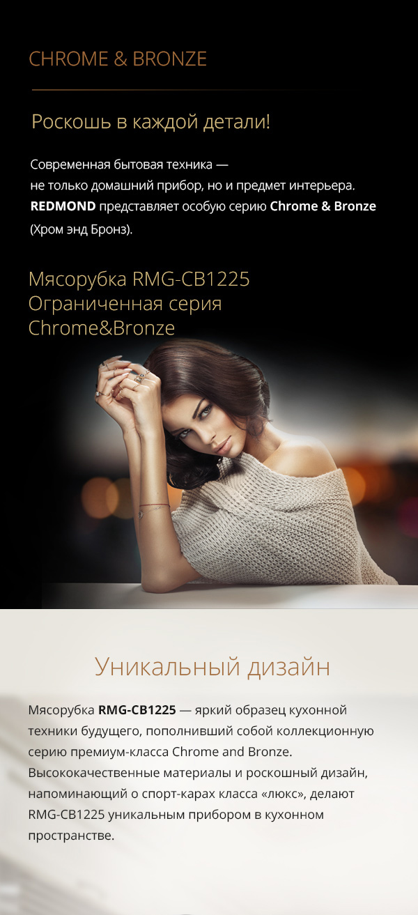 Мясорубка REDMOND RMG-CBM1225 — новая эксклюзивная модель из коллекционной серии премиум-класса CHROME AND BRONZE, которая помимо невероятной эффективности отличается безупречным дизайном и надёжностью. Этот уникальный инновационный прибор станет истинным украшением любой кухни даже самого искушённого гурмана.