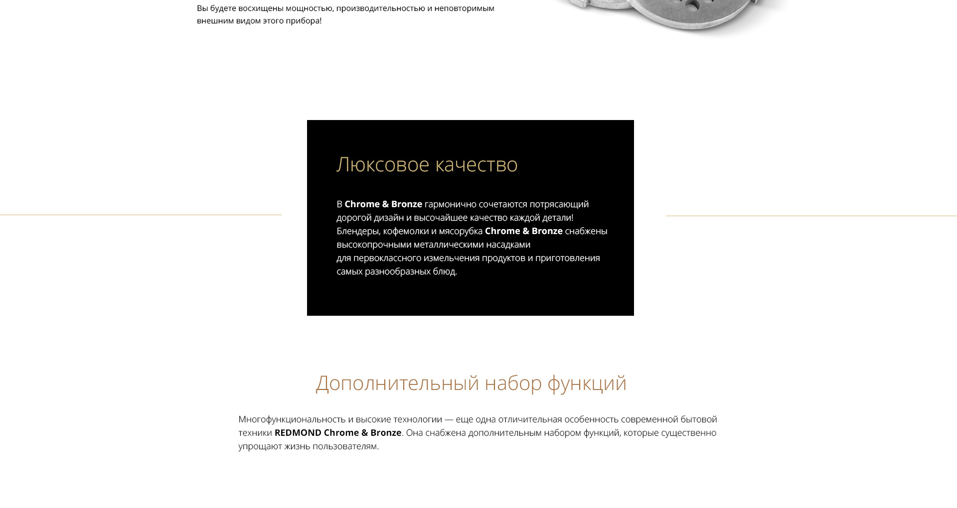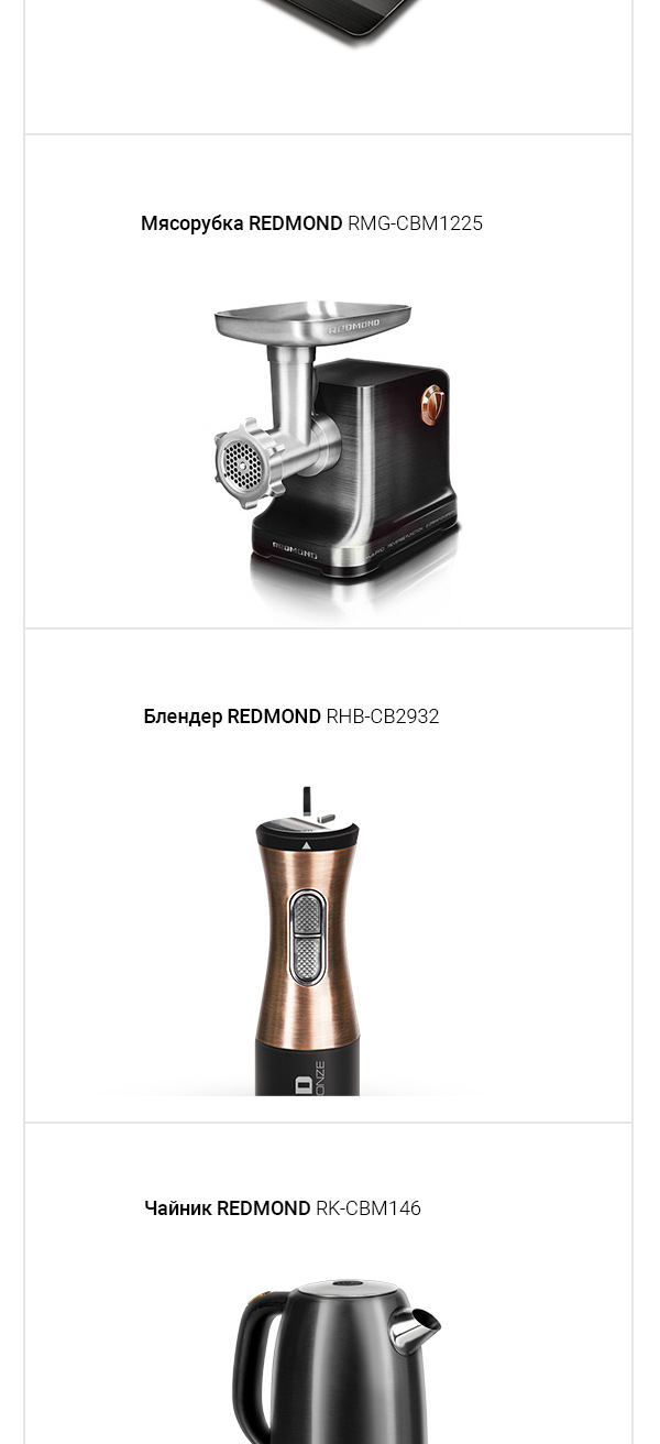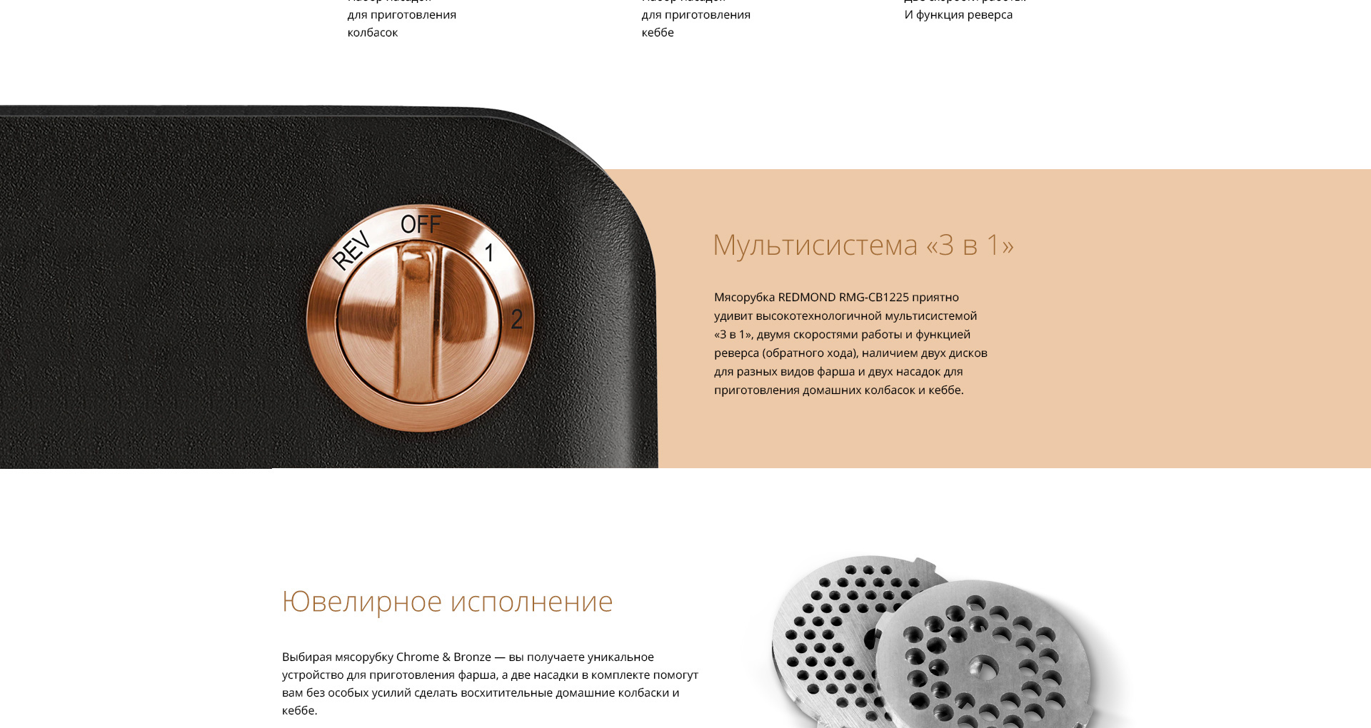 Мясорубка REDMOND RMG-CBM1225 — новая эксклюзивная модель из коллекционной серии премиум-класса CHROME AND BRONZE, которая помимо невероятной эффективности отличается безупречным дизайном и надёжностью. Этот уникальный инновационный прибор станет истинным украшением любой кухни даже самого искушённого гурмана.