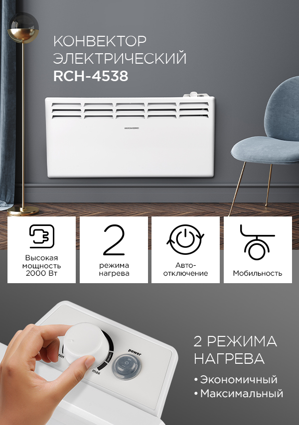 В RCH-4538 предусмотрен удобный функционал для точной настройки степени нагрева. Модель имеет два режима работы — экономичный и максимально мощный. С помощью терморегулятора вы можете установить подходящую температуру, и конвектор быстро прогреет всю комнату.