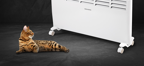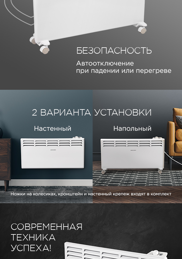 Прибор весит всего 5 кг и оснащен колесиками, которые позволяют с удобством перемещать его из помещения в помещение. Для экономии пространства конвектор также можно разместить на стене с помощью специального кронштейна. Настенное крепление, устойчивые ножки и колесики входят в комплект.