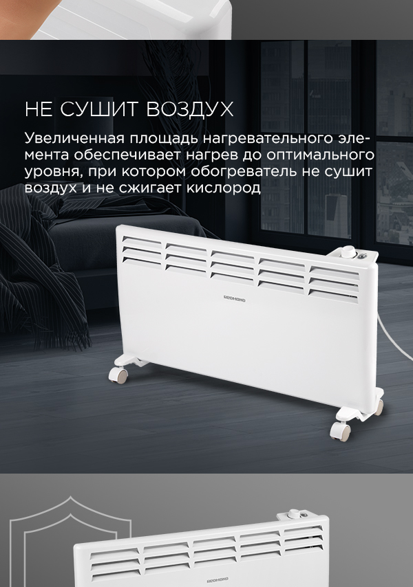 Конвектор REDMOND RCH-4538 — мощный и простой в управлении прибор, с которым легко создать комфортную атмосферу в квартире и прогреть неотапливаемые помещения — гараж, балкон, дачную веранду. Мобильный прибор подходит для использования в любом месте, где есть подключение к электрической сети.