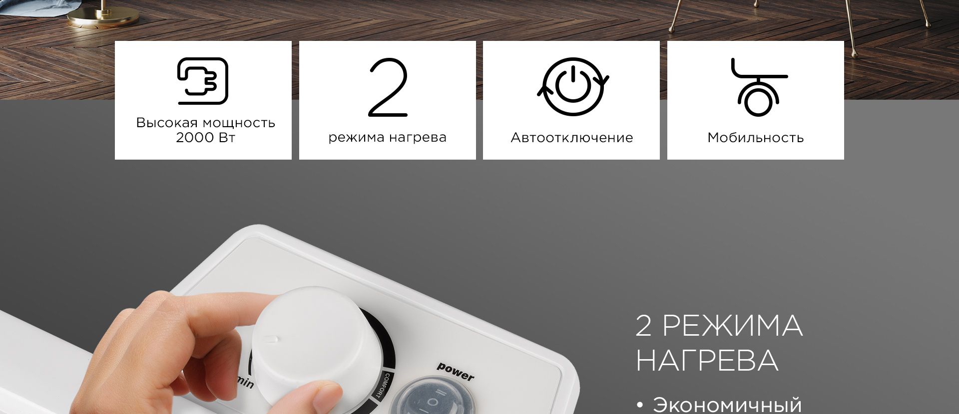 | Количество режимов работы | 2: умеренный - 1000 Вт/ интенсивный 2000 Вт |