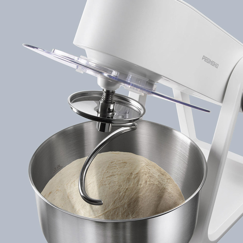 Мощность 1500 Вт обеспечивает стабильную работу с любыми ингредиентами. Миксер замешивает тесто для хлеба и взбивает холодные белки в плотную пену для десертов. Устройство подходит для разных задач и не ограничивает возможности на кухне.