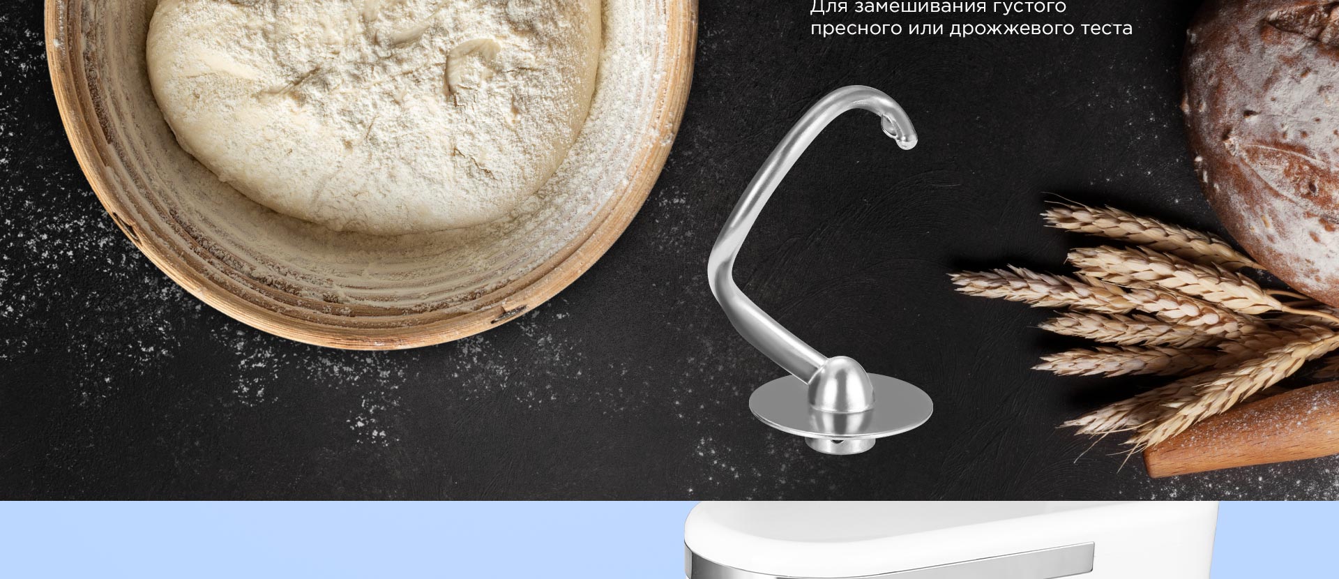 Модель обладает высокой мощностью 1100 Вт, поэтому с легкостью взбивает воздушные кремы и муссы, а также замешивает плотное дрожжевое тесто.