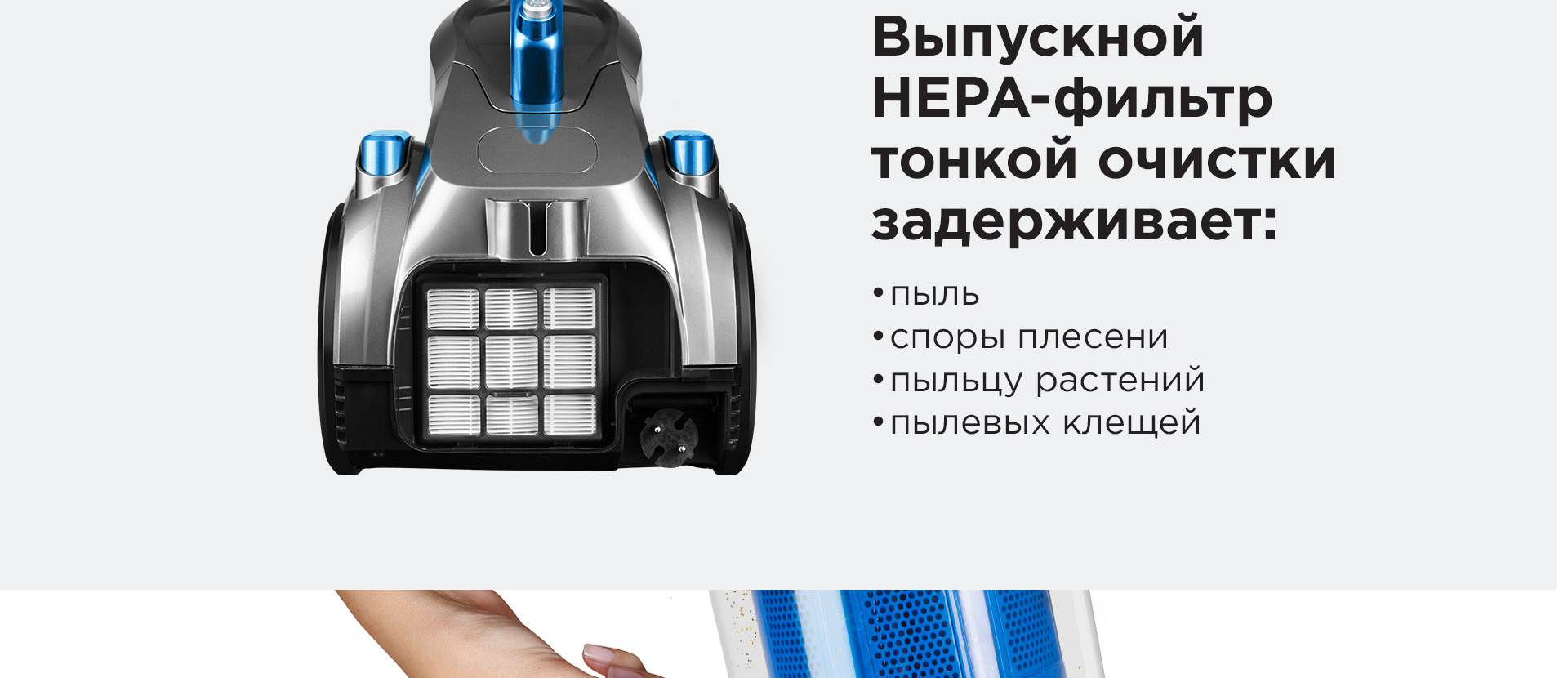 С теми частицами пыли, которые не удалось удержать циклонической системе очистки, справится НЕРА-фильтр. Он дополнительно очищает выходящий из пылесоса воздух, задерживая самые мелкие частицы, такие как растительная пыльца и другие аллергены.