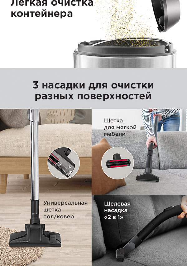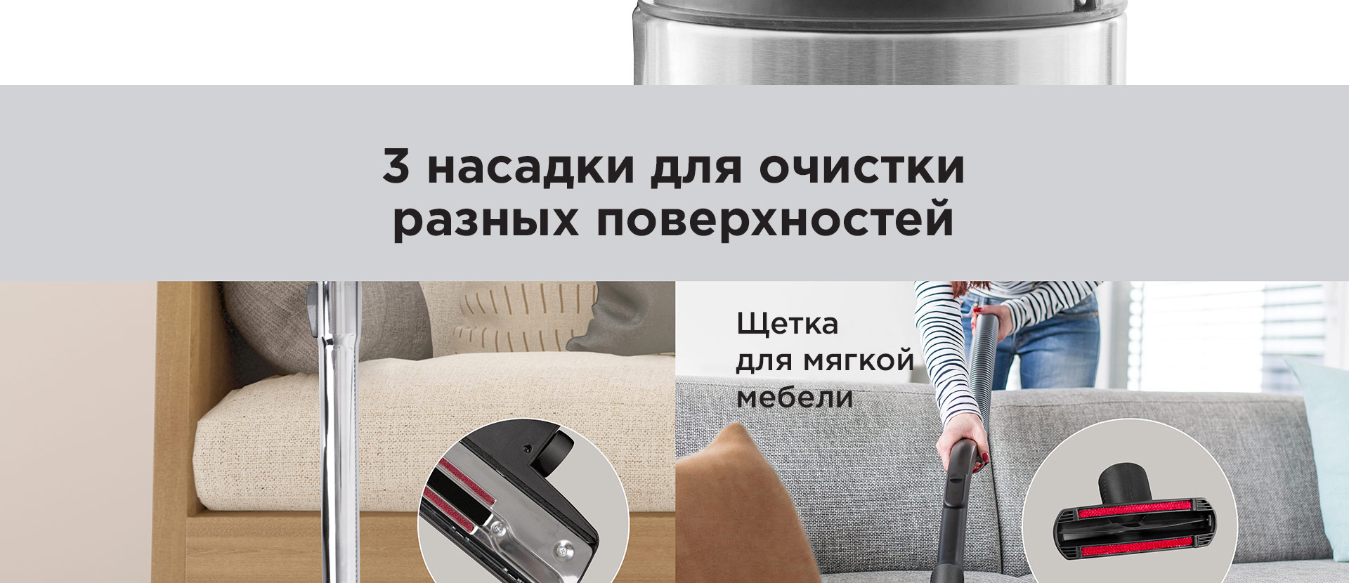 Вы сможете тщательно пропылесосить места, требующие глубокой очистки (ковры, напольные покрытия в домах с животными) и бережно очистить мебель и технику с помощью трех насадок: