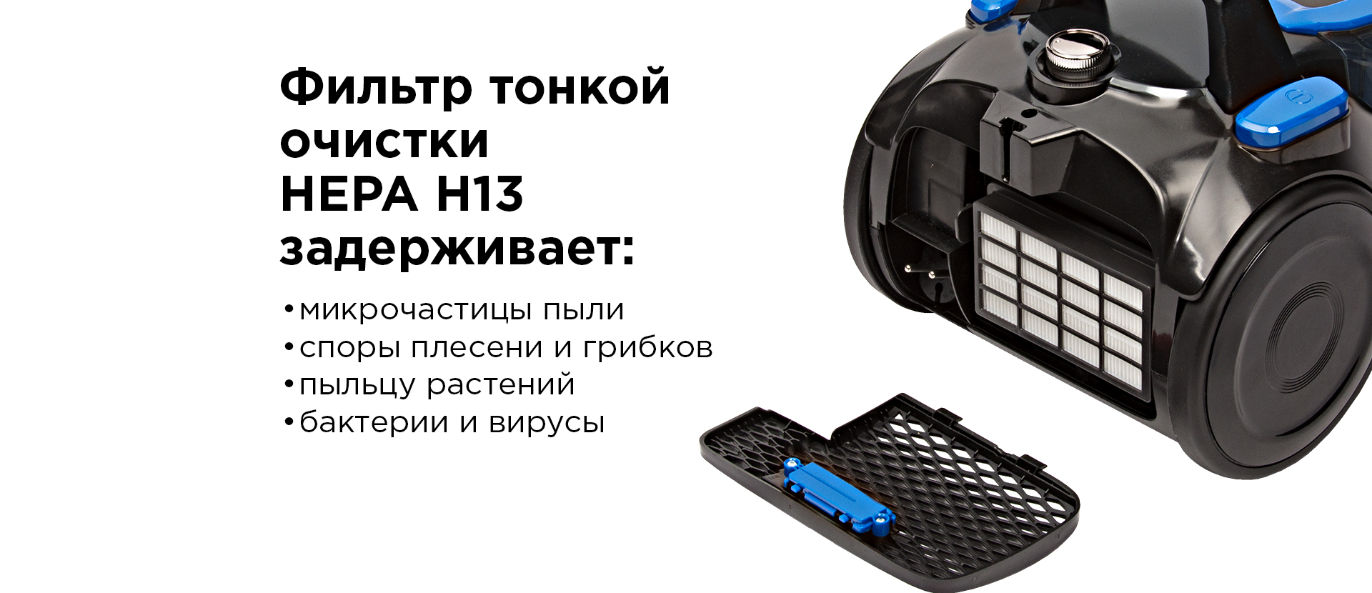 Пылесос тщательно удаляет не только видимый сор с поверхностей, но и очищает воздух в вашем доме от пыли. Всасываемый пылесосом сор оседает на дне контейнера-пылесборника. Освободившийся от сора воздух, прежде чем попасть обратно в комнату, проходит через фильтр тонкой очистки HEPA H13. Фильтр задерживает мелкодисперсную пыль и большинство воздушных аллергенов. Фильтр легко снимается, при загрязнении его можно промыть под водой.