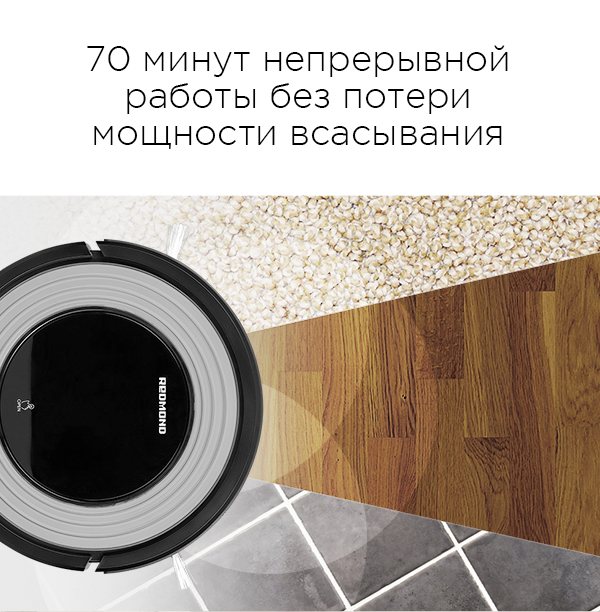 RV-R310 может непрерывно работать до 70 минут, не теряя мощности всасывания. Робот-пылесос прекрасно справляется с уборкой как гладких покрытий: ламината, кафельной плитки, паркета, линолеума, так и ковровых покрытий с ворсом до 2 см.