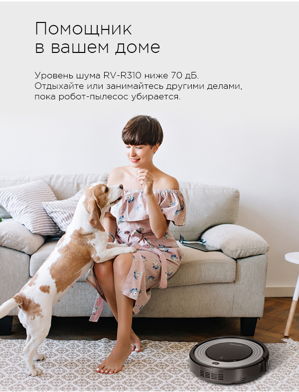 RV-R310 работает с уровнем шума менее 70 дБ, благодаря чему вы можете спокойно отдыхать или заниматься другими делами, пока робот-пылесос убирается.