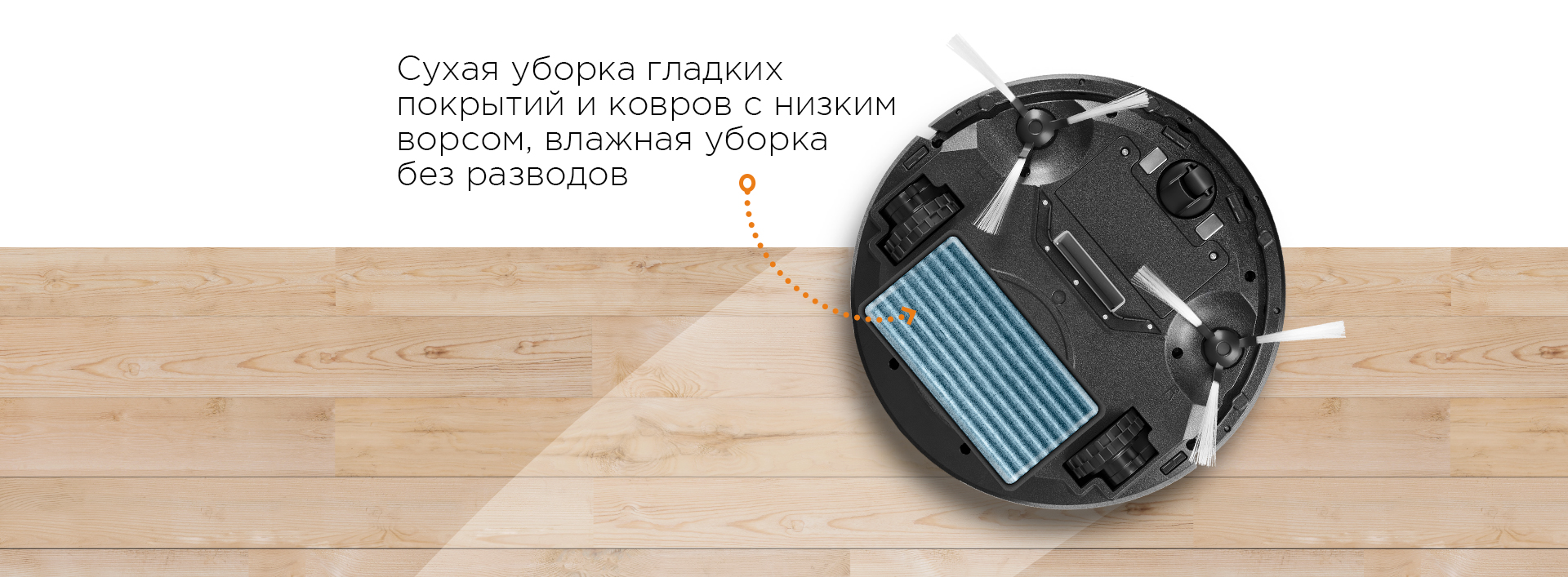 Робот-пылесос способен выполнять даже влажную уборку! Просто установите сменную насадку из микрофибры, предварительно увлажнив ее средством для мытья полов или просто водой – RV-R310 качественно очистит полы, не оставив разводов.