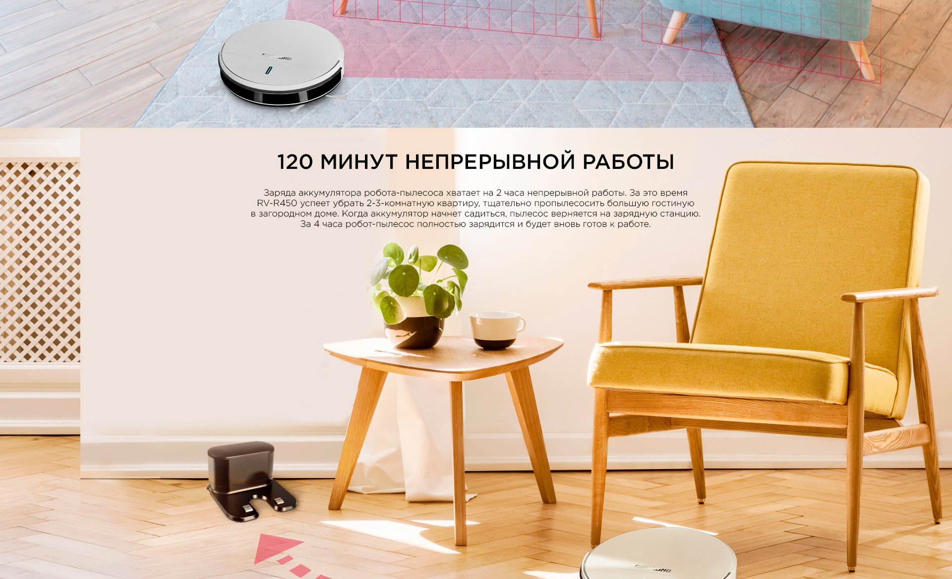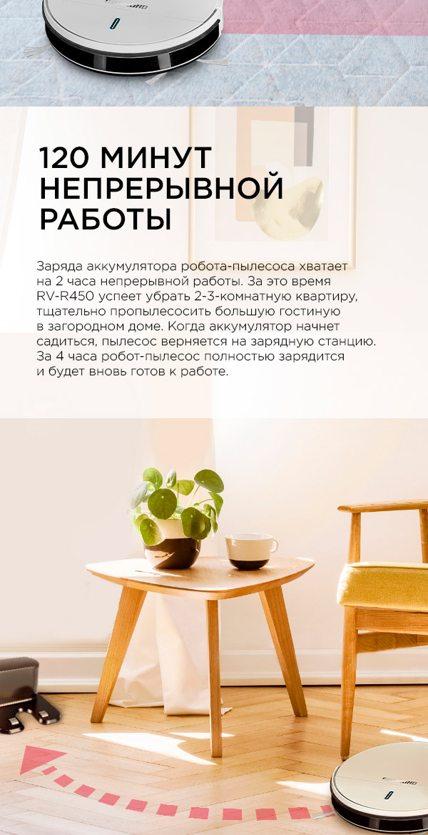 Емкий литий-ионный аккумулятор RV-R450 обеспечивает непрерывную работу прибора до 120 минут. За это время пылесос может успеть навести порядок в большой 2-3-комнатной квартире. Когда уровень заряда аккумулятора снизится, прибор самостоятельно вернется на зарядную станцию.