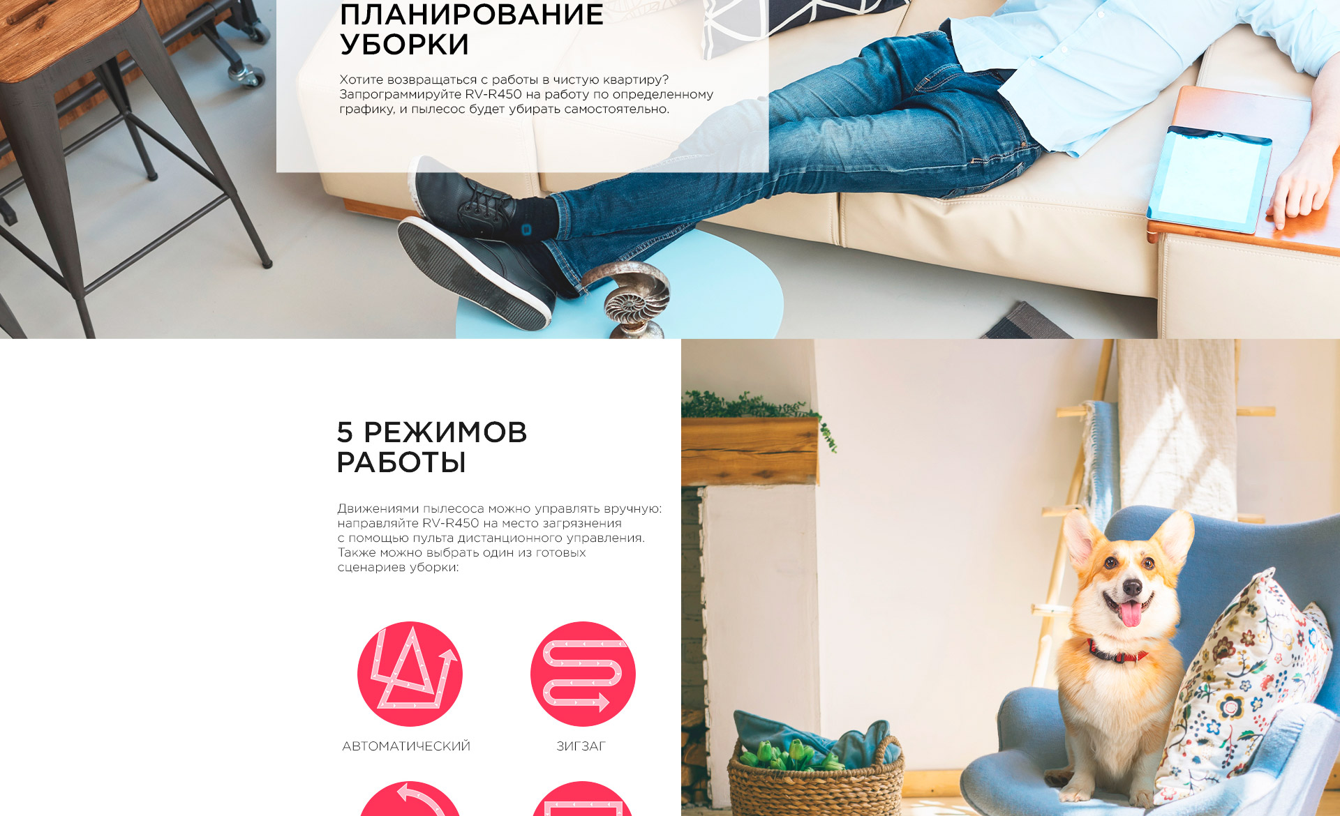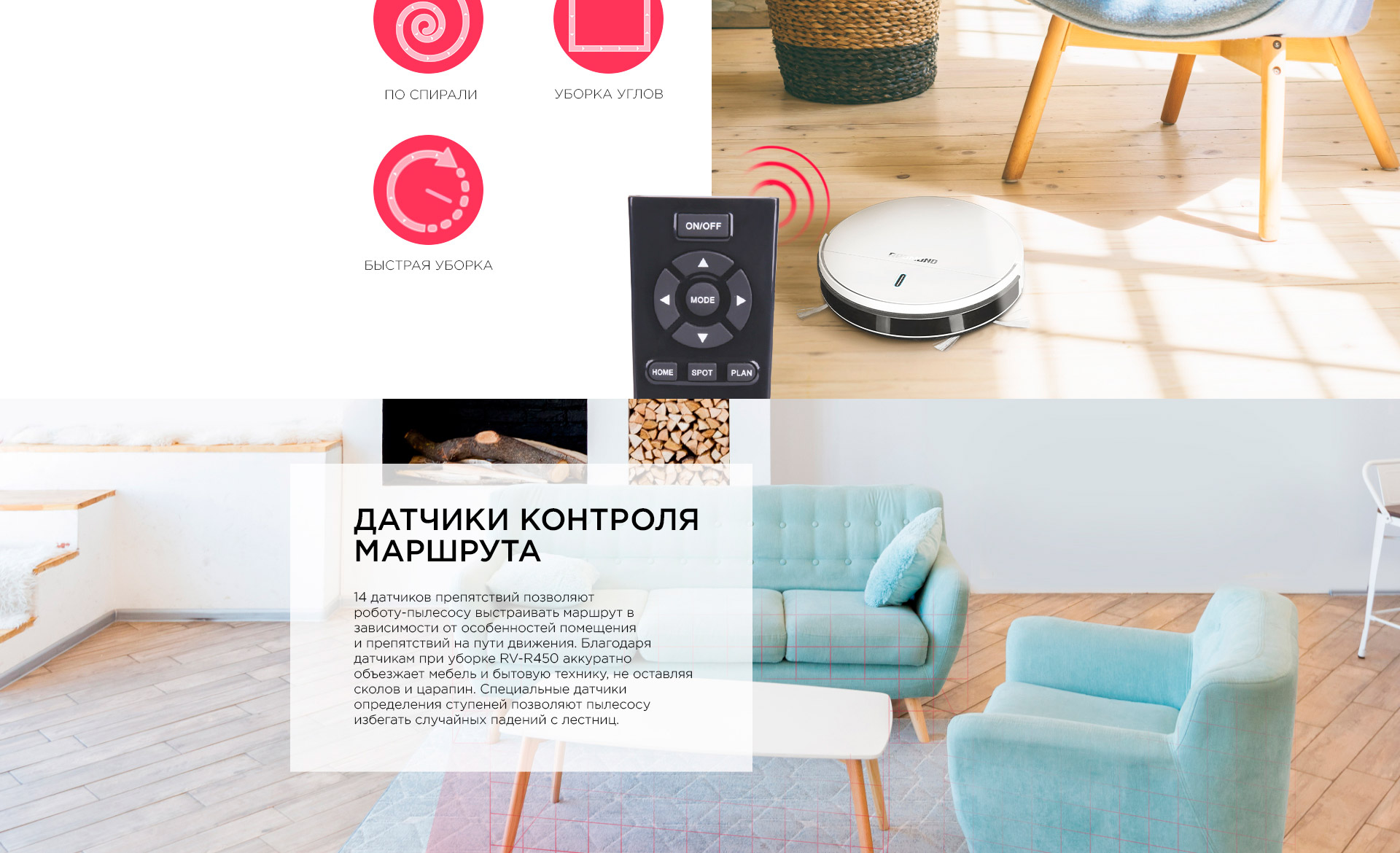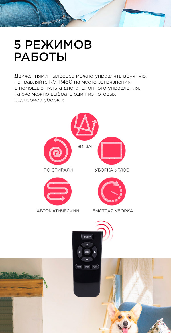 Траекторию движения для уборки робот-пылесос RV-R450 определяет автоматически. У прибора 5 режимов: